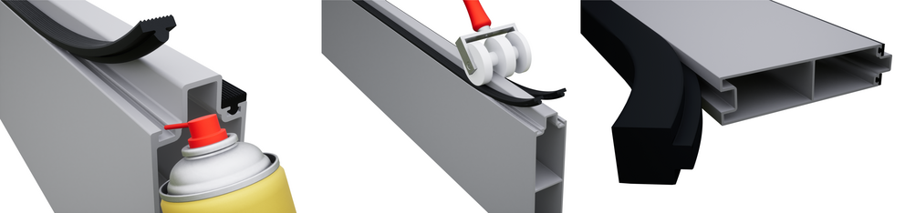 • A gátgerenda tömítést be kell nyomni mindkét horonyba a gátgerenda felső oldalán. Szerelési segédeszközként felhasználható a tömítőgörgő és a szilikonspray a könnyebb benyomás érdekében. A padlótömítést a gátgerenda alsó oldalára kell helyezni.