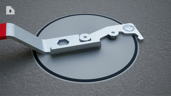 - Reteszelhető fedél (2 csavar) nyitása: Egy 6 mm-es imbuszkulccsal kb. 1 cm-re csavarja ki a csavarokat, a központi csavart pedig forgassa tovább addig, amíg már nem érez ellenállást, majd helyezze be az emelési segédeszközt, fordítsa el 90°-kal, és emelje ki.