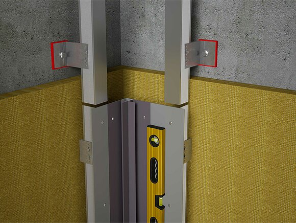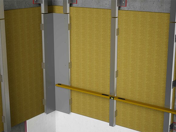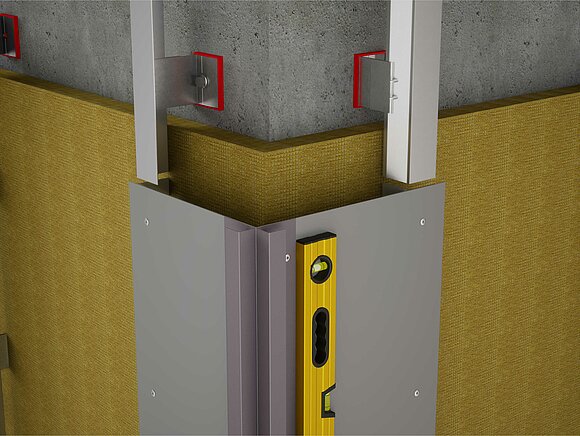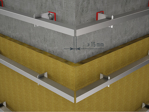 Ezután a belső vagy külső sarokprofilokat felszerelheti a tartó szögidomra. Ügyeljen a teljesen függőleges és tágulás szempontjából megfelelő szerelésre, valamint a fix- és csúszópontok elrendezésére.