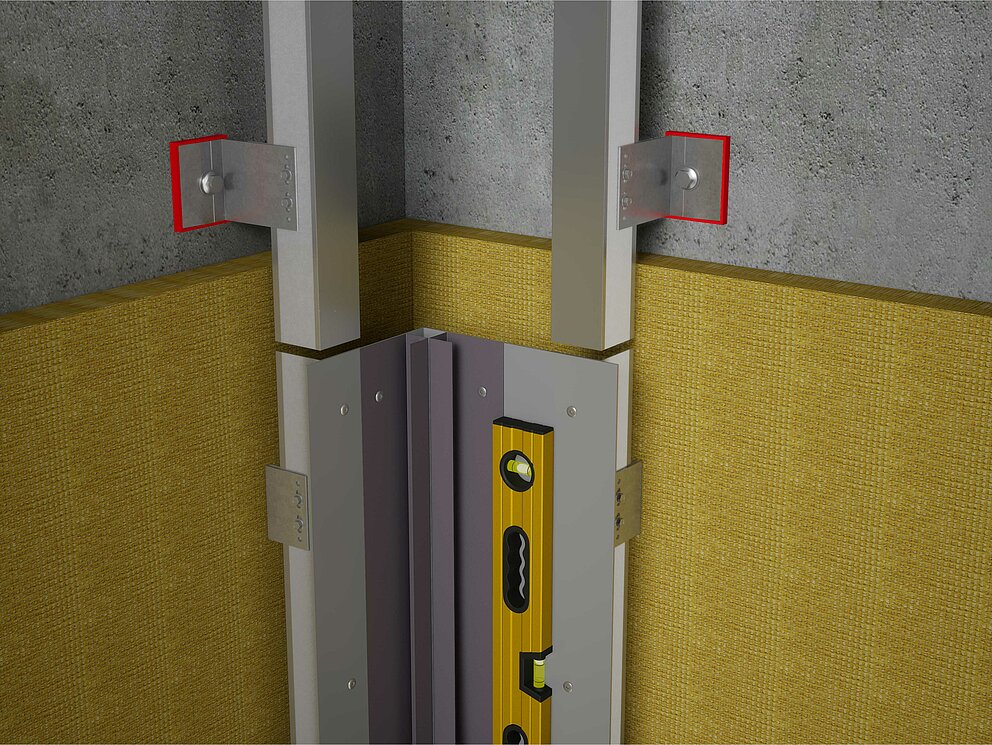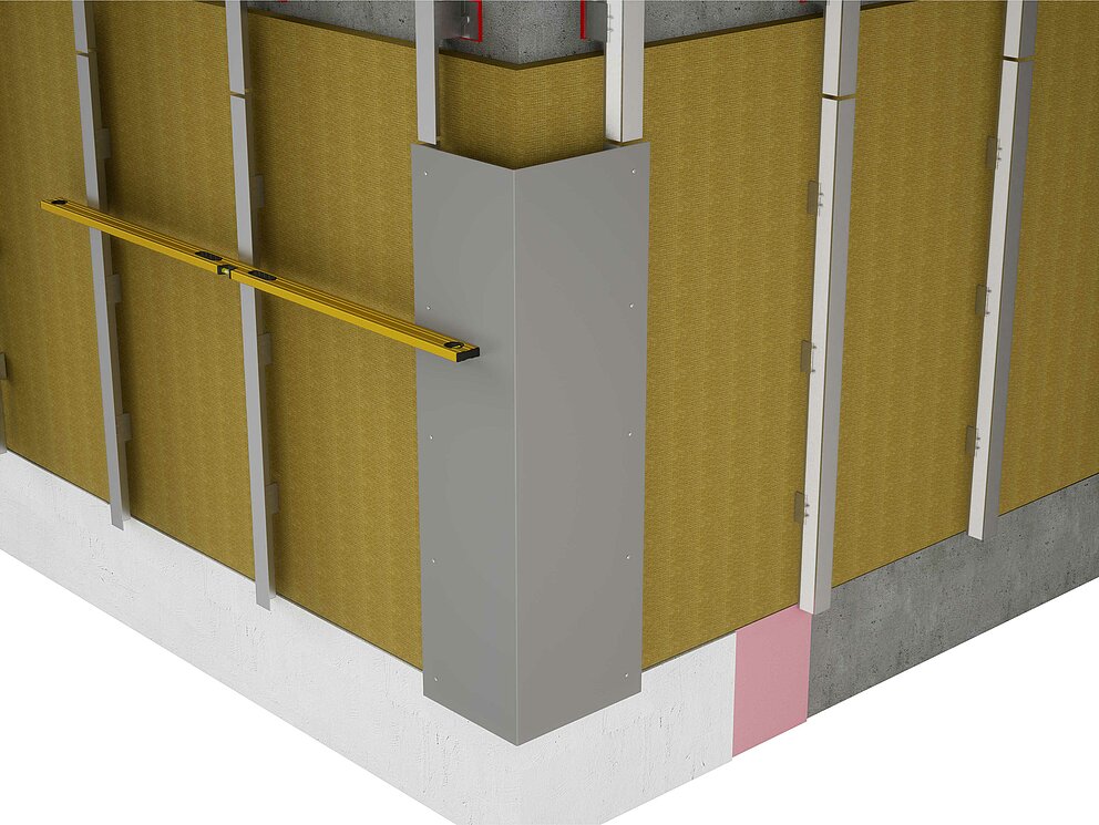 A belső vagy külső sarok felszereléséhez készítse elő az alátétszerkezetet a vízszintes profilszereléshez. A belső vagy külső sarokprofilok felszereléséhez először a függőleges alátétszerkezetet össze kell kötni egy 2 mm vastag alumíniumlemezből vagy 1 mm vastag horganyzott acéllemezből készült tartó szögidommal. A tartósíneket már az alátétszerkezet szerelésekor úgy helyezze beljebb a tartó szögidom anyagvastagságának megfelelően, hogy az alátétszerkezet síkfelülete biztosított legyen.