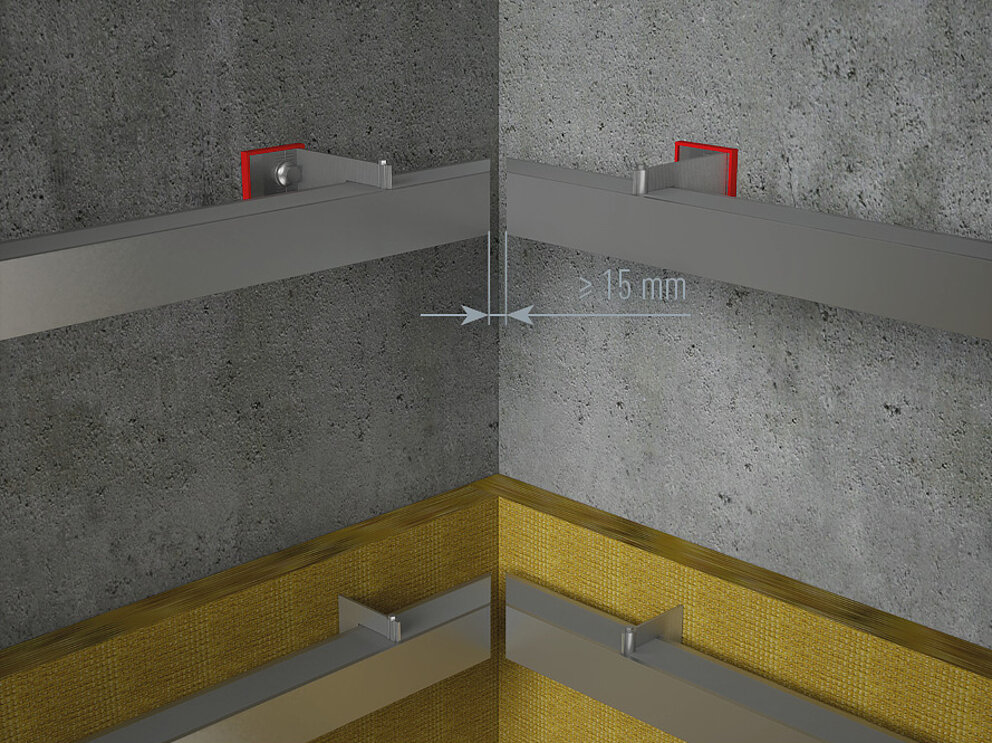 A belső vagy külső sarokprofilok felszerelésekor kerülje az alátétszerkezet tartósínjeinek tompaillesztését a sarok körül. Tartson min. 15 mm távolságot. Rögzítéskor ügyeljen a tágulás szempontjából megfelelő szerelésre, valamint a fix- és csúszópontok egyértelmű elrendezésére.