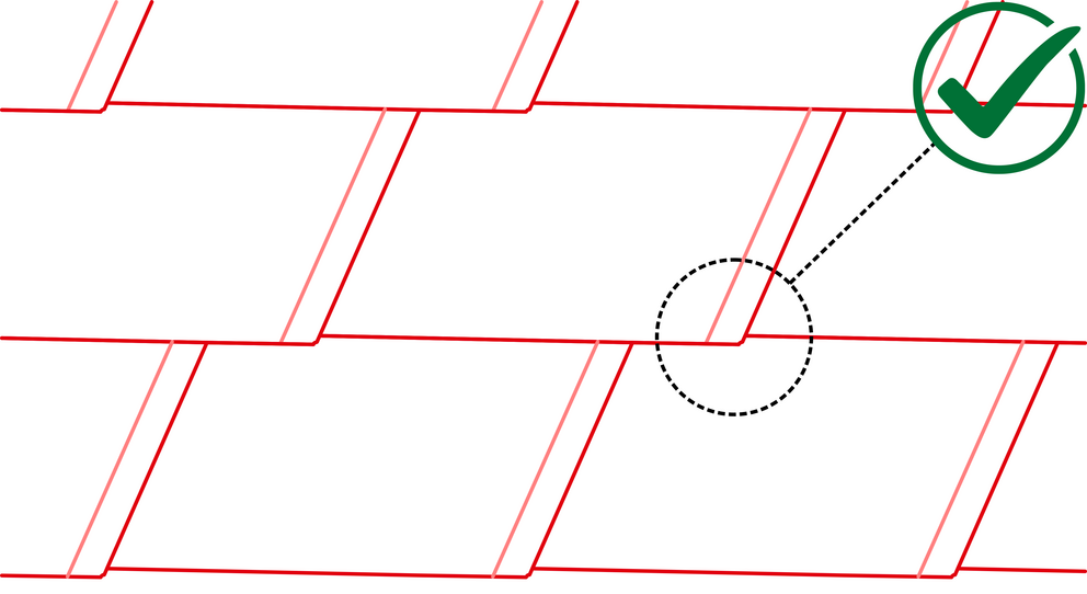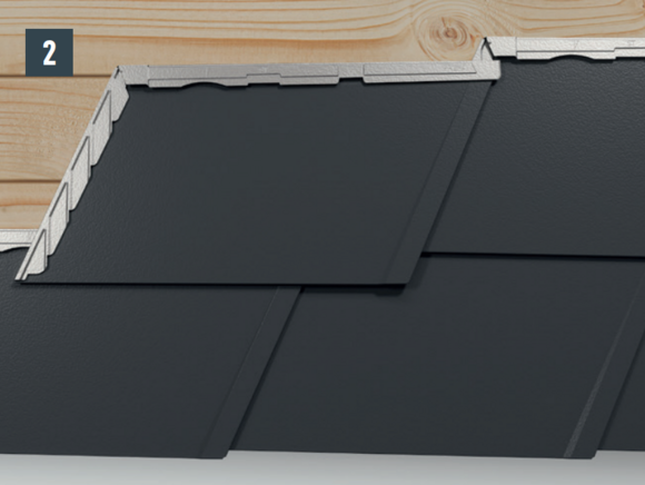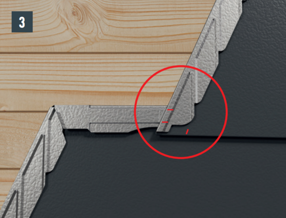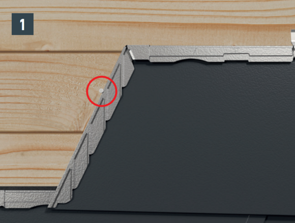 A tetőfedő zsindely alakja miatt a tetőfedő zsindely sarkánál vízcseppentő sarok keletkezik. A vízcseppentő sarok kialakulása akkor is maradjon meg, amikor minden sorban elhelyezi az első DS.19 tetőfedő zsindely; ehhez az első homlokzatburkoló zsindelyt ne tolja fel teljesen a párkányelem éléig, ill. a korcba. Az első DS.19 tetőfedő zsindely bal sarkát annyira engedje le, hogy a zsindely felső visszahajtása teljes hosszában a kijelölt párhuzamos zsinórjelhez illeszkedjen. A soronkénti első DS.19 tetőfedő zsindely „túlhúzását” el kell kerülni.