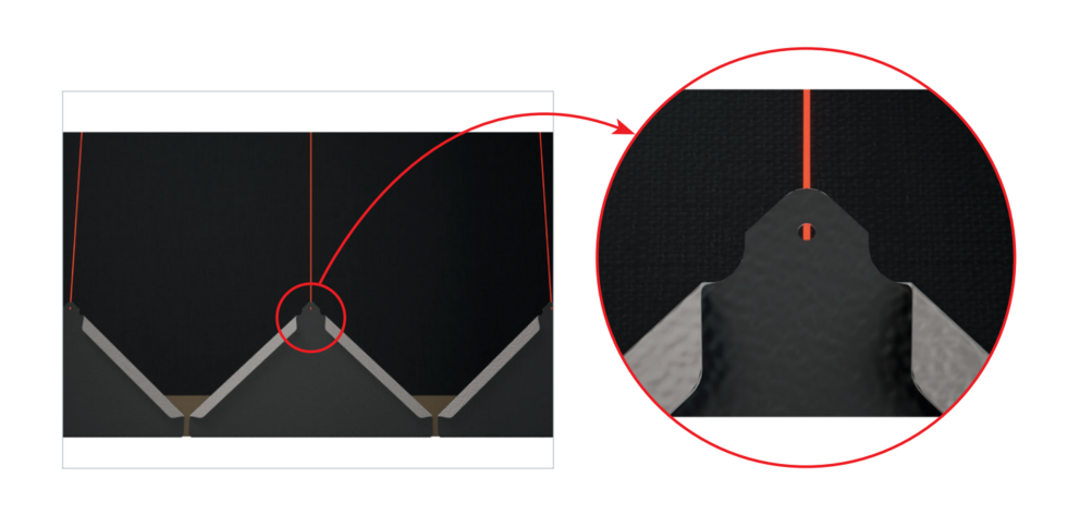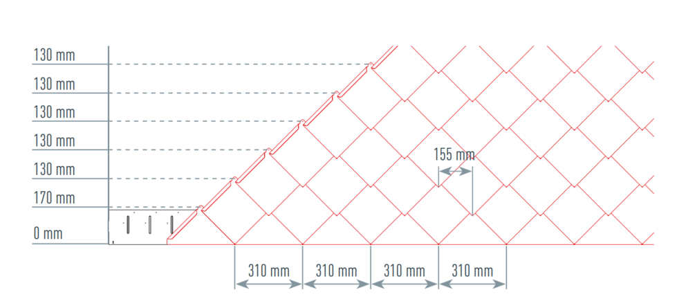 A 20 × 29 PREFA homlokzatburkoló rombusz elhelyezésének megkönnyítése érdekében 450 mm-enként célszerű függőleges zsinórvonalakból álló zsinórképet készíteni (segítségként szolgálnak a párkányelemek jelölései). Annak érdekében, hogy a zsinórméret minden sorban pontosan tartható legyen, szükség esetén a zsinórméret felét is meg lehet jelölni, amit rendszeres távolságonként ellenőrizni kell. Igazítsa hozzá a felső szélükön megjelölt indítólemezeket a függőleges zsinórvonalakhoz. A párkányelemek jelölése nem méretadó a 20 x 20 homlokzati rombuszokhoz. Ennek során ügyelni kell arra, hogy az oldalsó felhajtás (pl. oldalsó lezárás, ill. épületsarok) ne a 29 × 29 tetőfedő rombuszok közepén legyen (vegye figyelembe a homlokzat szimmetriáját).