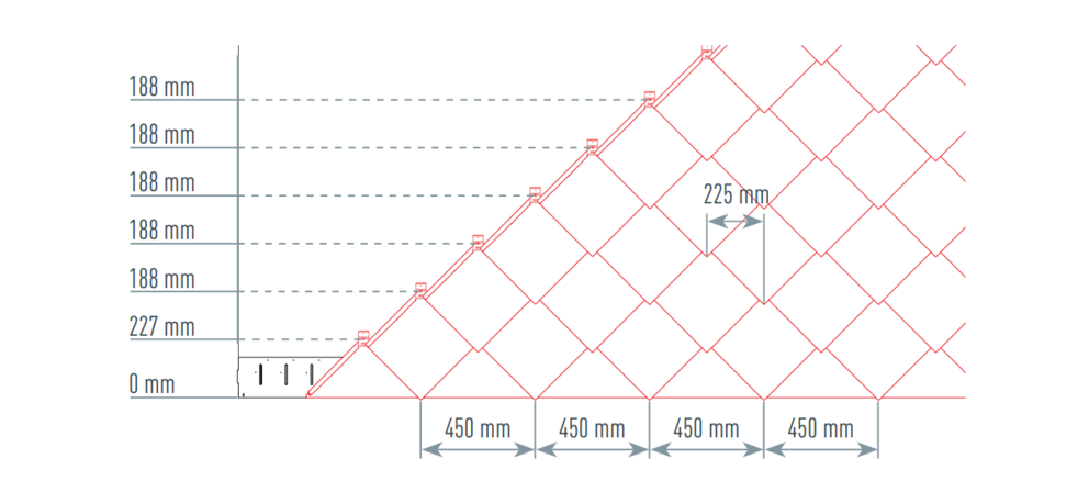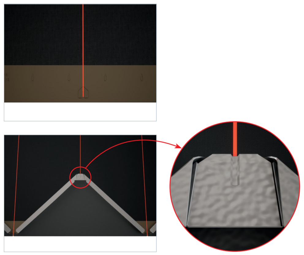 A 29 × 29 PREFA homlokzatburkoló rombusz elhelyezésének megkönnyítése érdekében 450 mm-enként célszerű függőleges zsinórvonalakból álló zsinórképet készíteni (segítségként szolgálnak a párkányelemek jelölései). Annak érdekében, hogy a zsinórméret minden sorban pontosan tartható legyen, szükség esetén a zsinórméret felét is meg lehet jelölni, amit rendszeres távolságonként ellenőrizni kell. Igazítsa hozzá a felső szélükön megjelölt indítólemezeket a függőleges zsinórvonalakhoz. Ennek során ügyelni kell arra, hogy az oldalsó felhajtás (pl. oldalsó lezárás, ill. épületsarok) ne a 29 × 29 tetőfedő rombuszok közepén legyen (vegye figyelembe a homlokzat szimmetriáját).