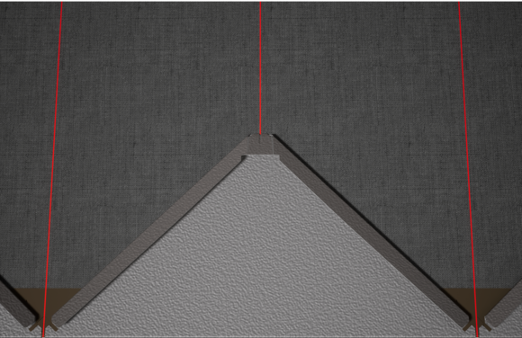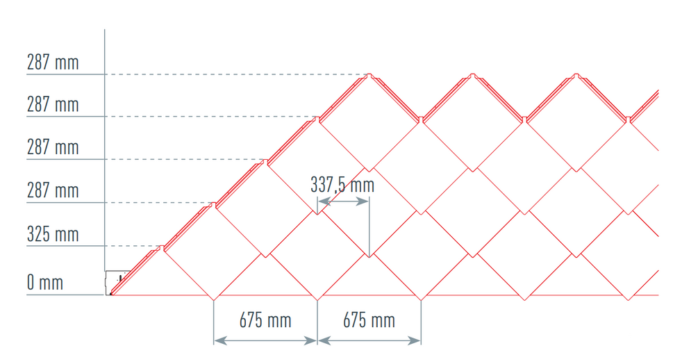 A 44 × 44 PREFA homlokzatburkoló rombusz elhelyezésének megkönnyítése érdekében 675 mm-enként célszerű függőleges zsinórvonalakból álló zsinórképet készíteni (segítségként szolgálnak a párkányelemek jelölései). Annak érdekében, hogy a zsinórméret minden sorban pontosan tartható legyen, szükség esetén a zsinórméret felét is meg lehet jelölni, amit rendszeres távolságonként ellenőrizni kell. Igazítsa hozzá a felső szélükön megjelölt indítólemezeket a függőleges zsinórvonalakhoz. Ennek során ügyelni kell arra, hogy az oldalsó felhajtás (pl. oldalsó lezárás, ill. épületsarok) ne a 44 × 44 homlokzatburkoló rombuszok közepén legyen (vegye figyelembe a homlokzat szimmetriáját).