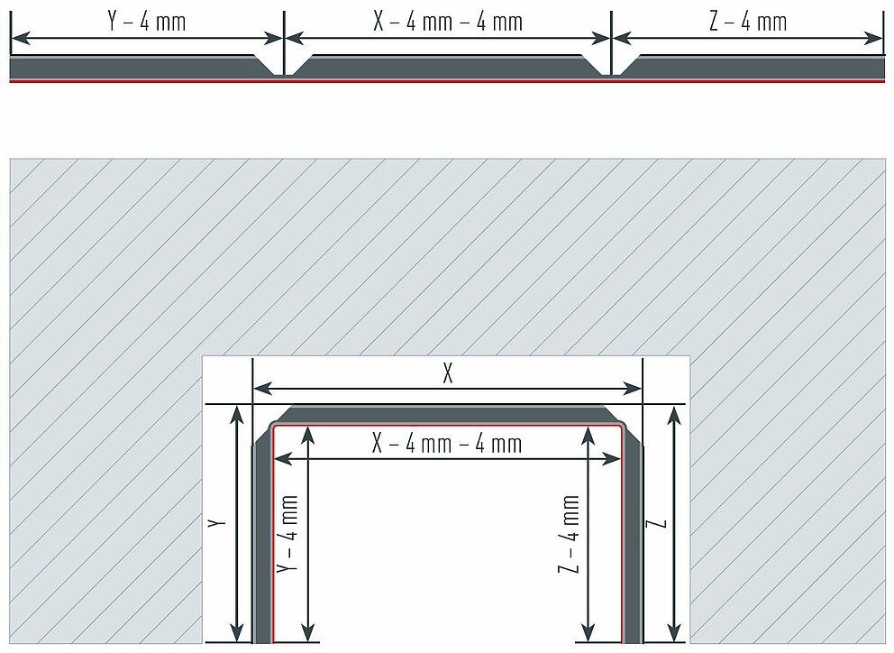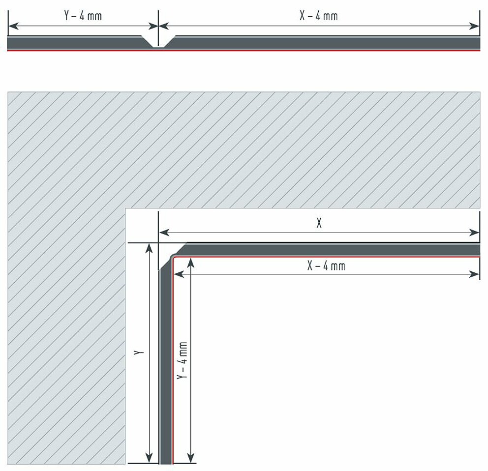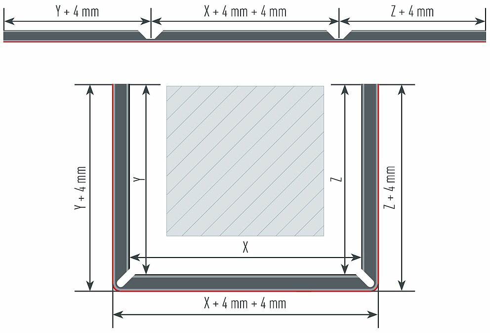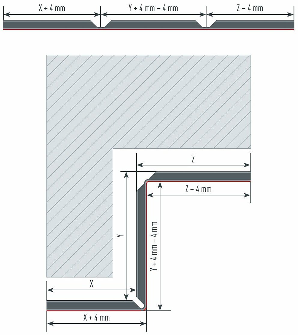 Külső sarok esetén a kompozit lemez anyagvastagságát (4 mm) hozzá kell adni a mért természetes méretekhez.