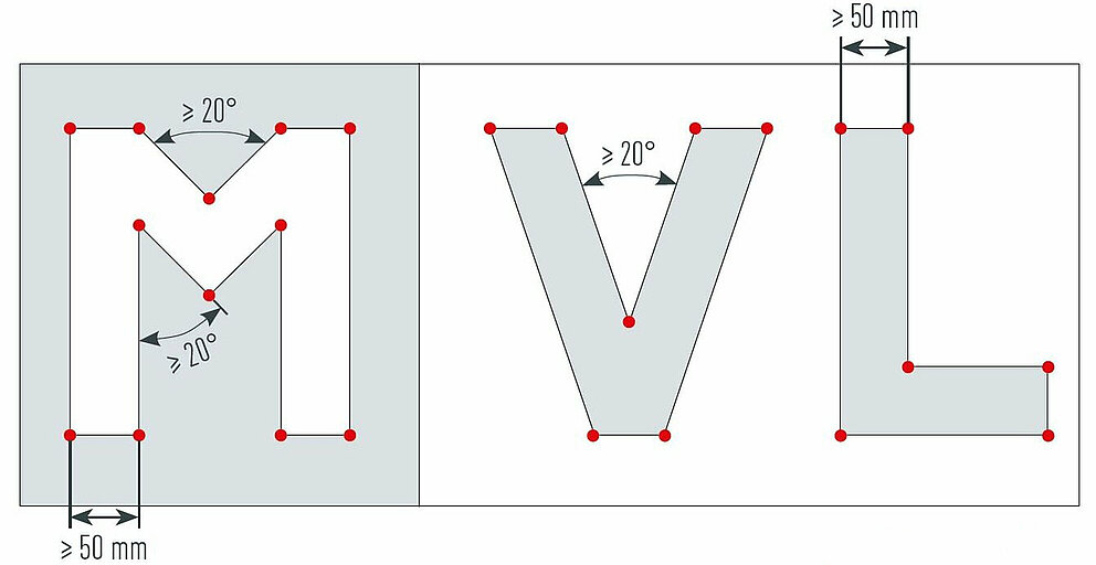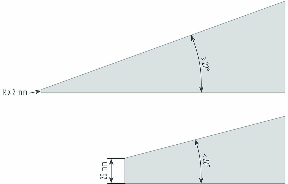 Vegye figyelembe az anyagtechnikailag lehetséges minimális méreteket és szögeket. Hegyes szögek 20°-os szögnyílástól gyárthatók. Ha a szögnyílás 20° alatt van, a szög csúcsát legalább 25 mm-es sávval kell lezárni.