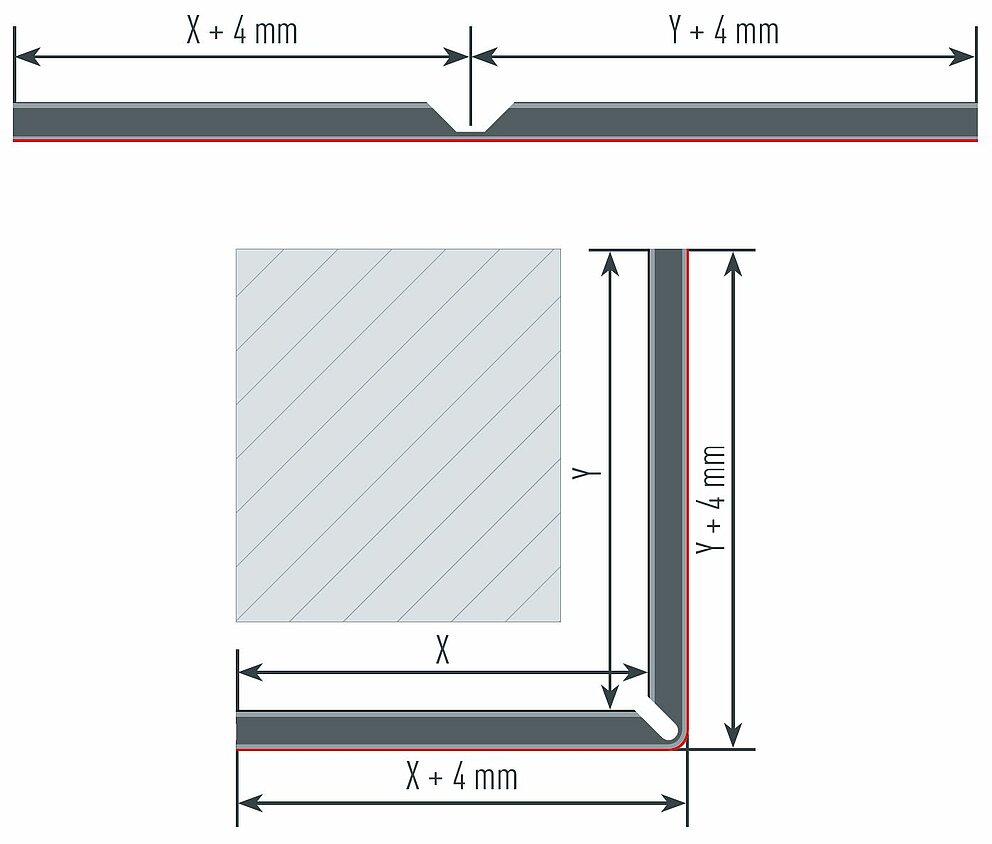 Belső sarok esetén a kompozit lemez anyagvastagságát (4 mm) le kell vonni a mért természetes méretekből.