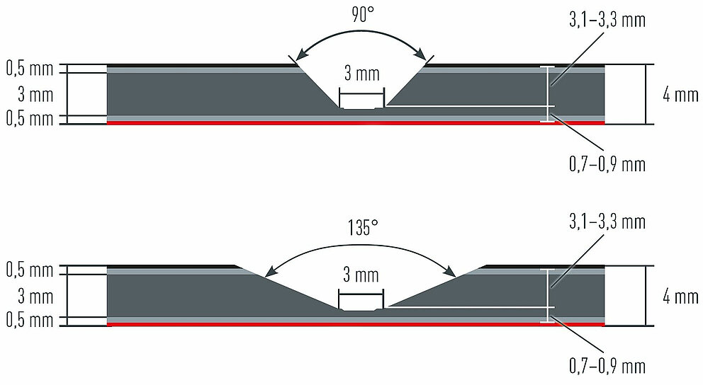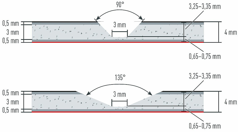 A PREFA azt javasolja, hogy különösen az A2 magos kompozit lemezeknél a V-nút marást csak CNC-megmunkáló gép segítségével végezzék, a megfelelő marási mélység biztosítása érdekében.