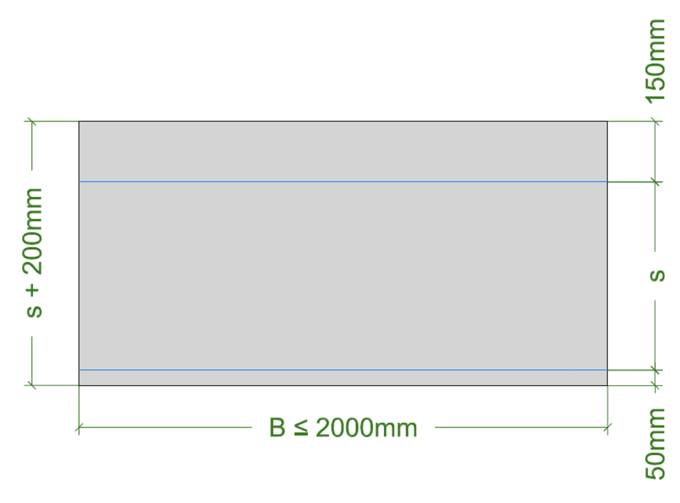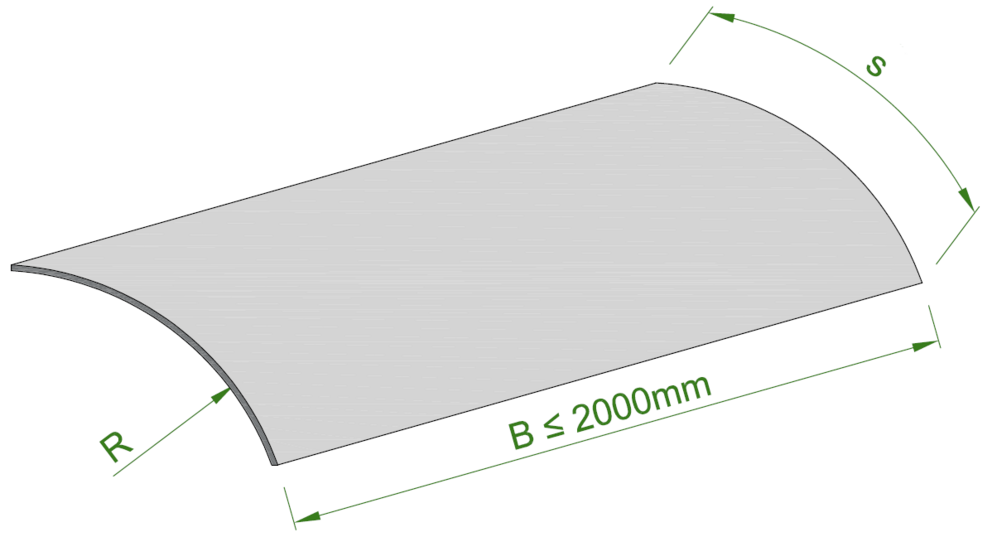 A hengerek közötti hajlításból adódóan a lemezeken egy kifutó rész keletkezik egy kis benyomódással, amelyet a PREFA visszavág. Vegye figyelembe a nyersanyag méreteit! Ugyanis a vágási szélesség a lemezek végein 200 mm-rel nagyobb, mint a ténylegesen szükséges ívhossz. Az ívhosszhoz (s) az egyik végén 150 mm-t, a másikon 50 mm-t kell hozzáadni.