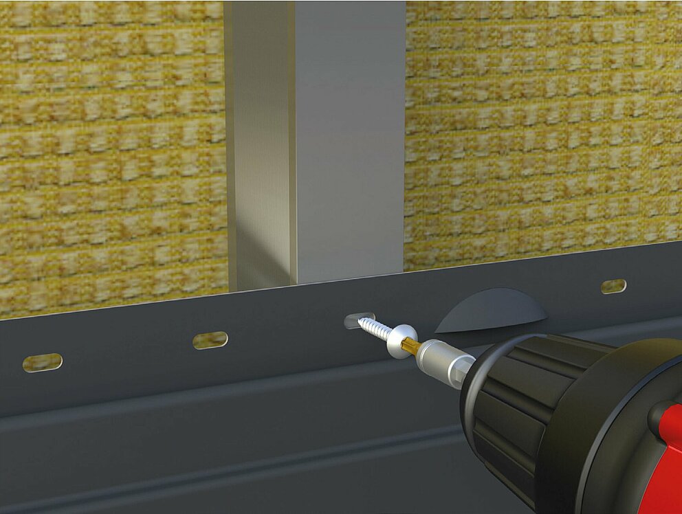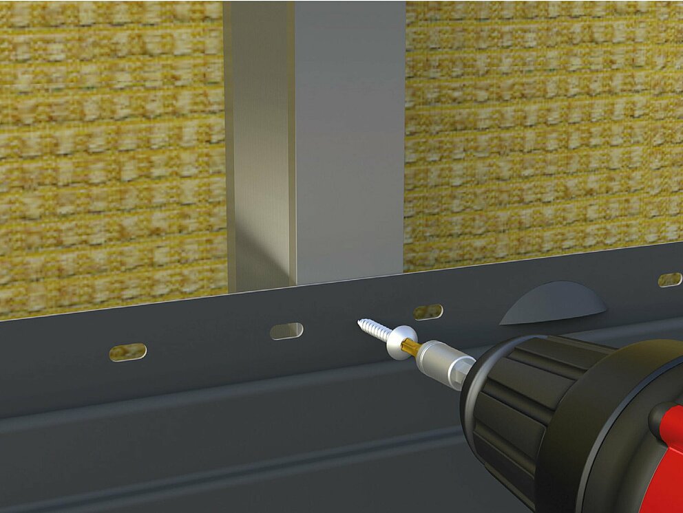A rögzítőcsavart a rögzítőfülön lévő, előre kialakított ovállyukon keresztül középen kell behajtani a tartósínbe. Ha közvetlenül egy alátétszerkezeti tartósín felett nincs előre kialakított ovállyuk, akkor pl. hosszlyukcsípővel készítsen egyet, hogy ezzel lehetővé váljon a Siding kényszermentes tágulása.