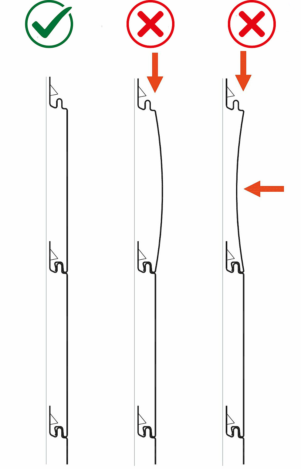Kérjük, ügyeljen arra, hogy a beszerelést az egyes elemek nyomásmentes állapotában kell elvégezni. Az elemek rögzítésekor ne illessze túl szorosan egymásba a Siding, Siding.X és perforált Siding elemeket, mert túlságosan megfeszülhetnek. A Siding elemek homorú vagy domború deformációja minimalizálásának érdekében az elemeknek teljesen síkban kell felfeküdniük az alátétszerkezetre.