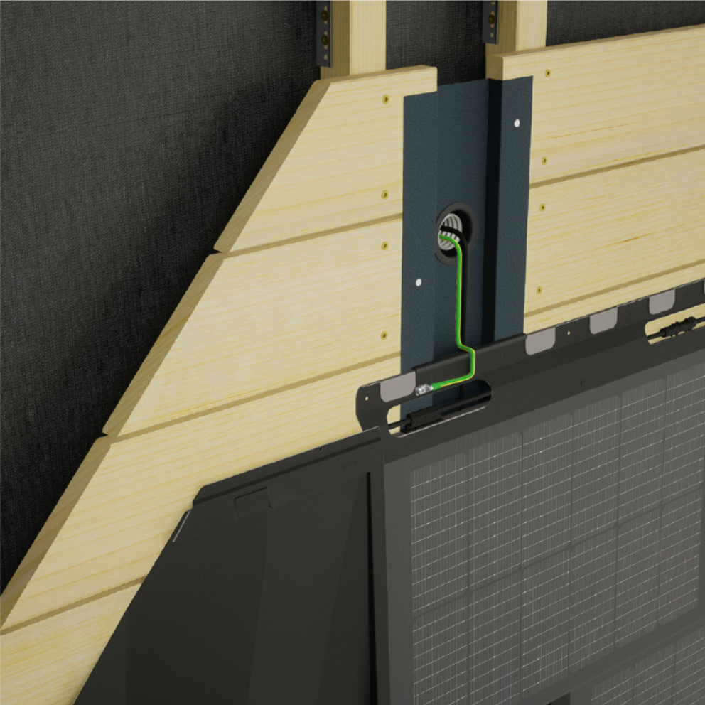 A sztringvezetékek behelyezése és a potenciálkiegyenlítő vezeték rögzítése a napelemes tetőfedő panelre a mellékelt a rögzítéssel.