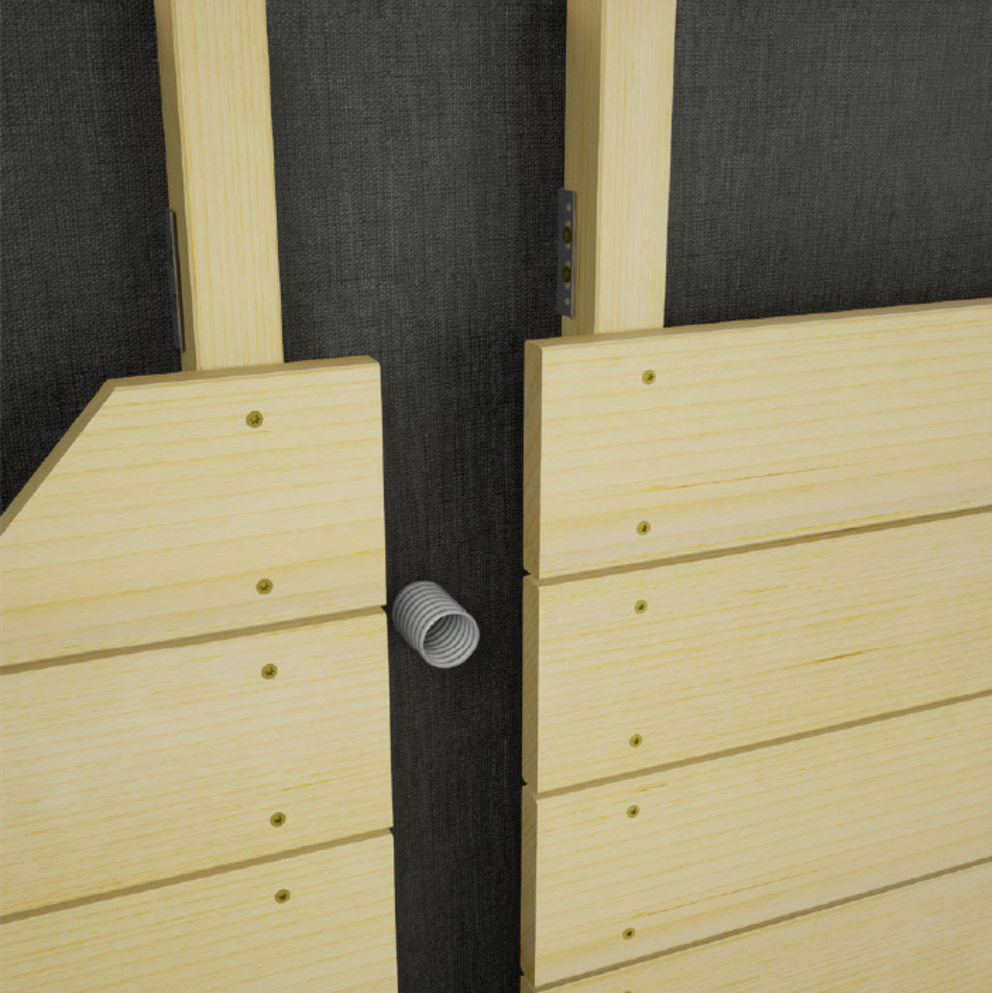Az előregyártott kábelcsatorna beszerelése a fa deszkázatba. Fontos, hogy a faláttörés központosan helyezkedjen el a kábelcsatorna nyílása mögött.
