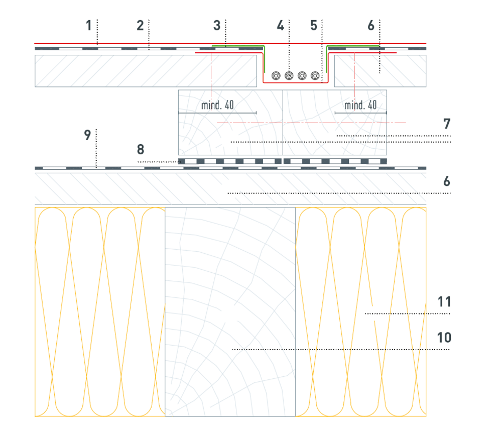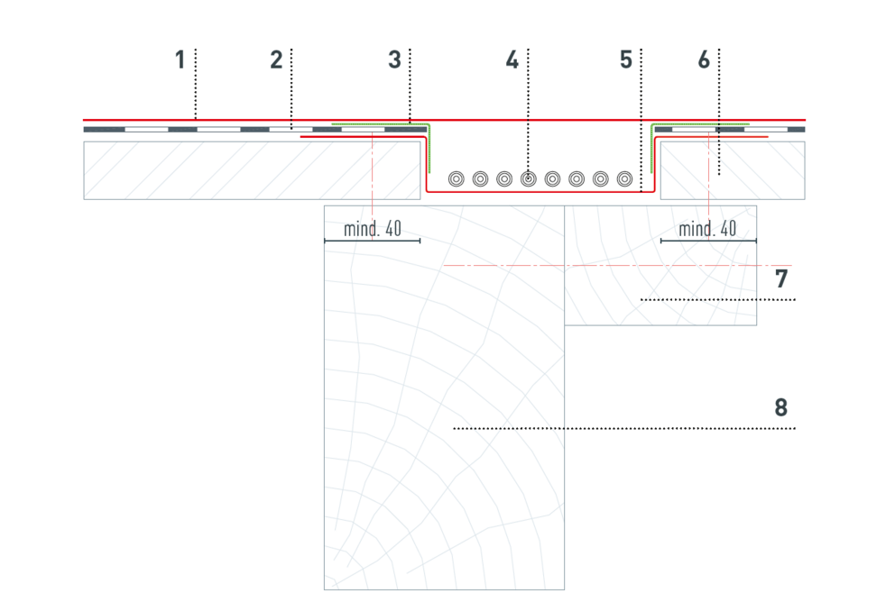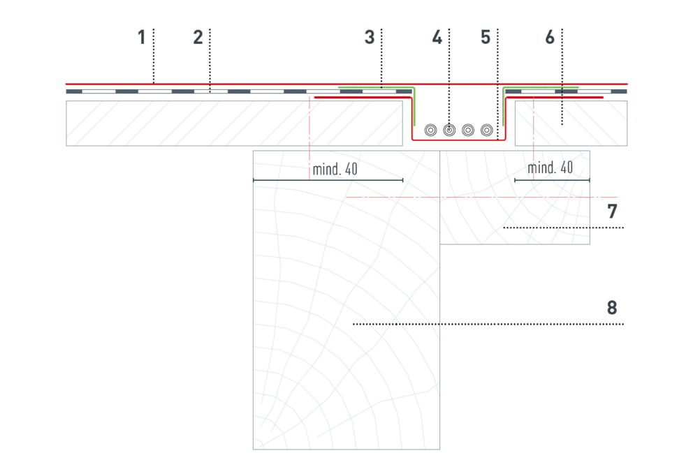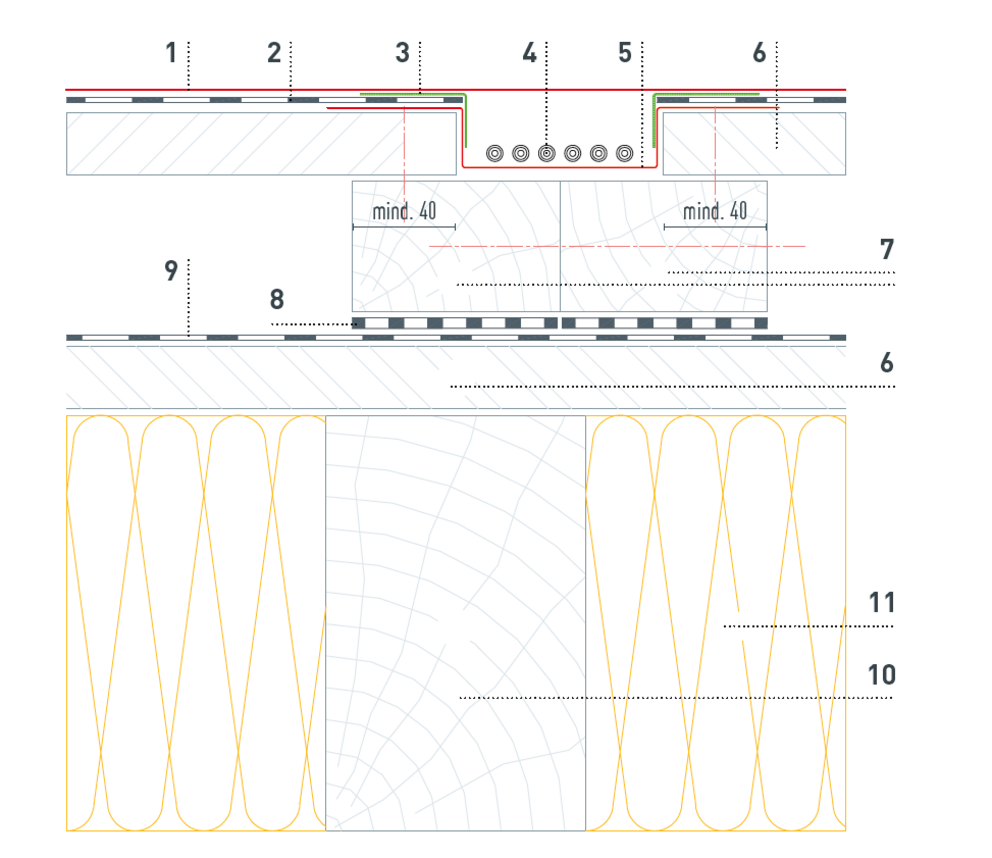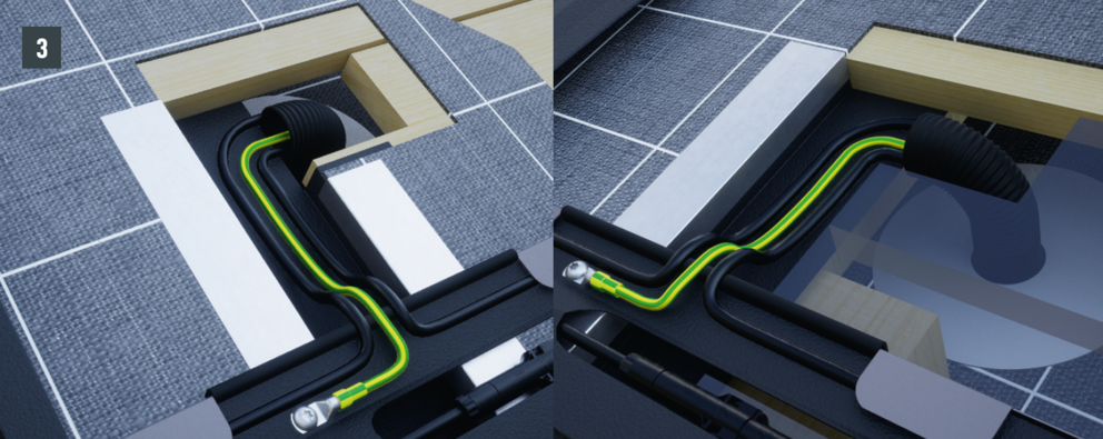 A szükséges kábelvezetés alapján a fa alátétszerkezetet a következő részleteknek megfelelően kell elkészíteni. A kábelcsatornák számát és pozícióját a PREFA terméktechnika határozza meg és a PV fektetési tervben jeleníti meg.