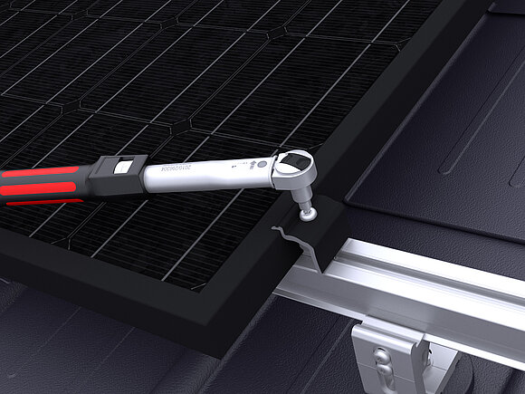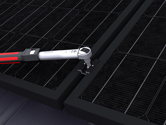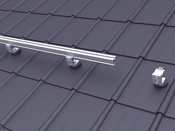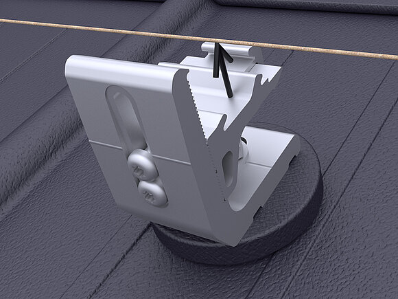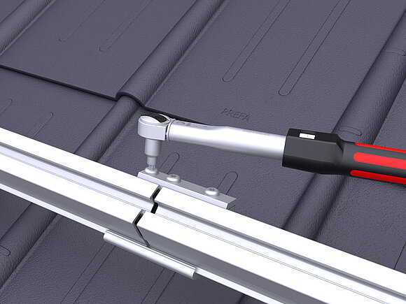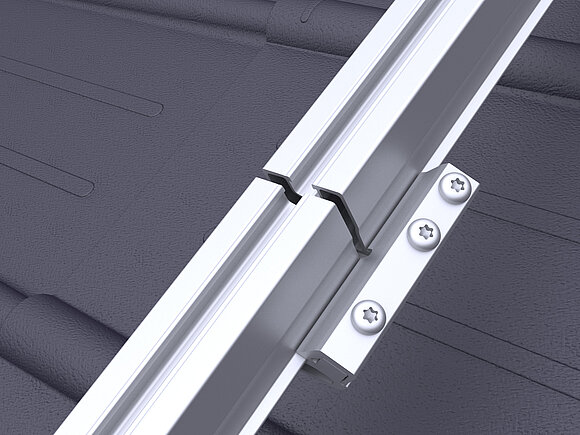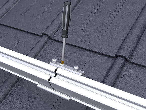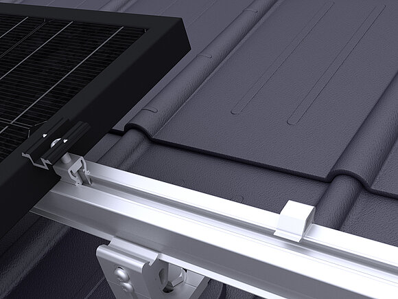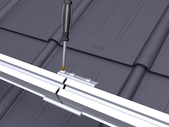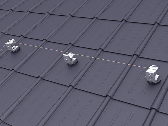 Ennek során a tetőfelület legalsó modulsorában modulonként két modul leesésgátlót kell a felső (gerinc felőli) modulsínre rögzíteni.