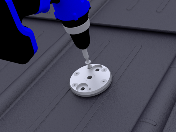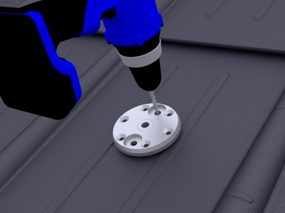 Talpelem csavaros rögzítése 2-2 rögzítőcsavarral ⌀ 8×220 mm (kéthéjú tetőrétegrend) vagy ⌀ 8×120 mm (egyhéjú tetőrétegrend) szarufán, amíg a felülettömítés a tetőfedő elemre és alátétszerkezetre lesz préselve. Megfelelő kivitelezés esetén a felülettömítés enyhén kidudorodik (fúrógép bitfeje: T40).