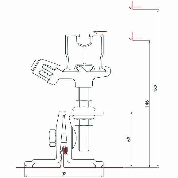 A menetes szár laza ráhelyezése profilsíntartóval és ellenanyákkal. Anyák kézi kontrázása a profilsíntartó lehetséges későbbi magasságátállításához (18-as villáskulcs).