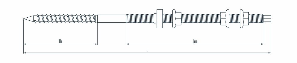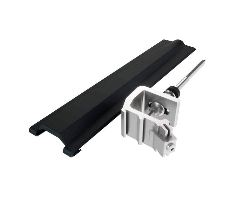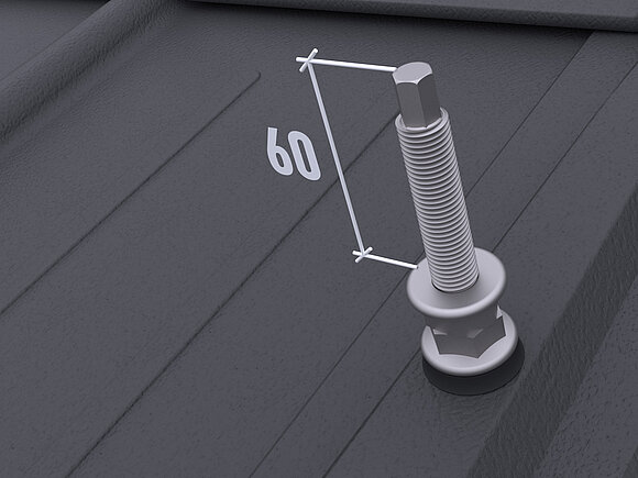 Anya becsavarozása, amíg az EPDM-tömítés kifelé kidudorodik (18-as villáskulcs). Szerelje fel a második anyát, és tekerje egészen ütközésig lefelé. Az állványcsavart a második anya felső élétől (síntartó felfekvése) mérve 60 mm-rel felfelé mérje ki, és vágja le. Szerelje fel a síntartót, és a megfelelő magasságban (a többi napelemtartóhoz igazítva) két villáskulccsal húzza meg (18-as villáskulcs).