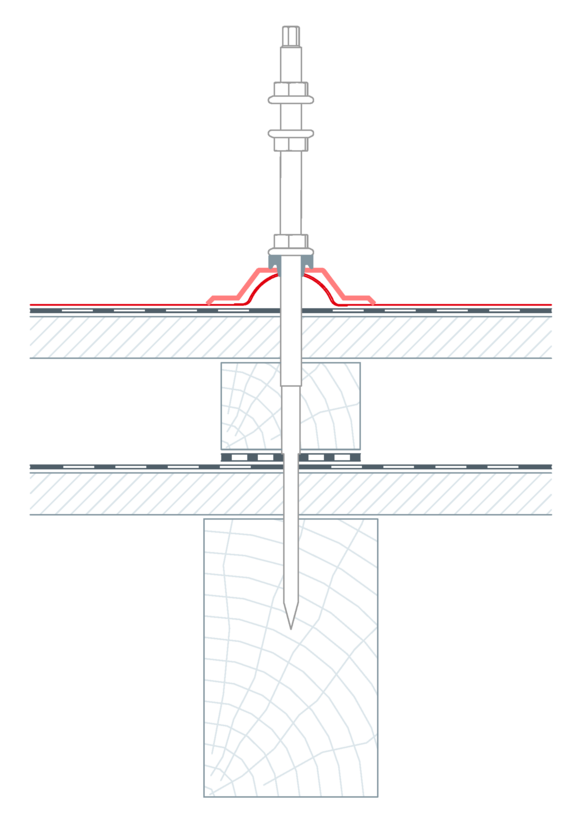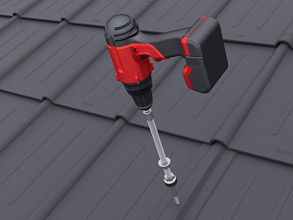 Jelölje meg az állványcsavar pozícióját. Fúrja elő a faszerkezetet ⌀ 8 mm-rel. Fúrja fel a Sunny Spezial és Classic elemeket ⌀ 13 mm-rel. Csavarozza be az állványcsavart fúrógéppel (9-es dugókulcsbetét). Behajtási mélység a tartó alátétszerkezetbe (szarufa): legalább 80 mm.