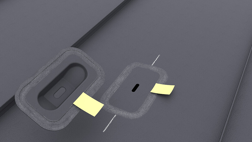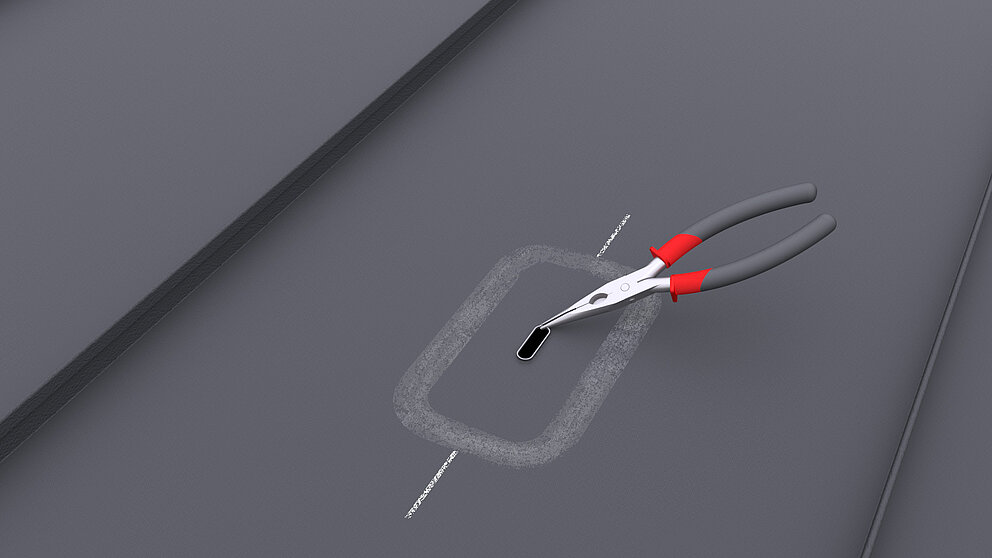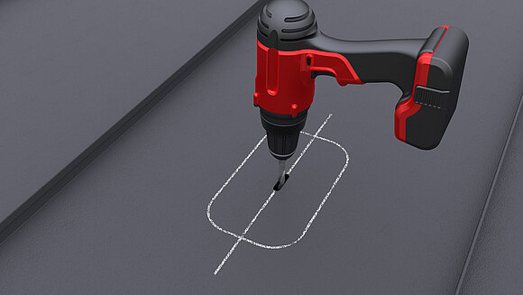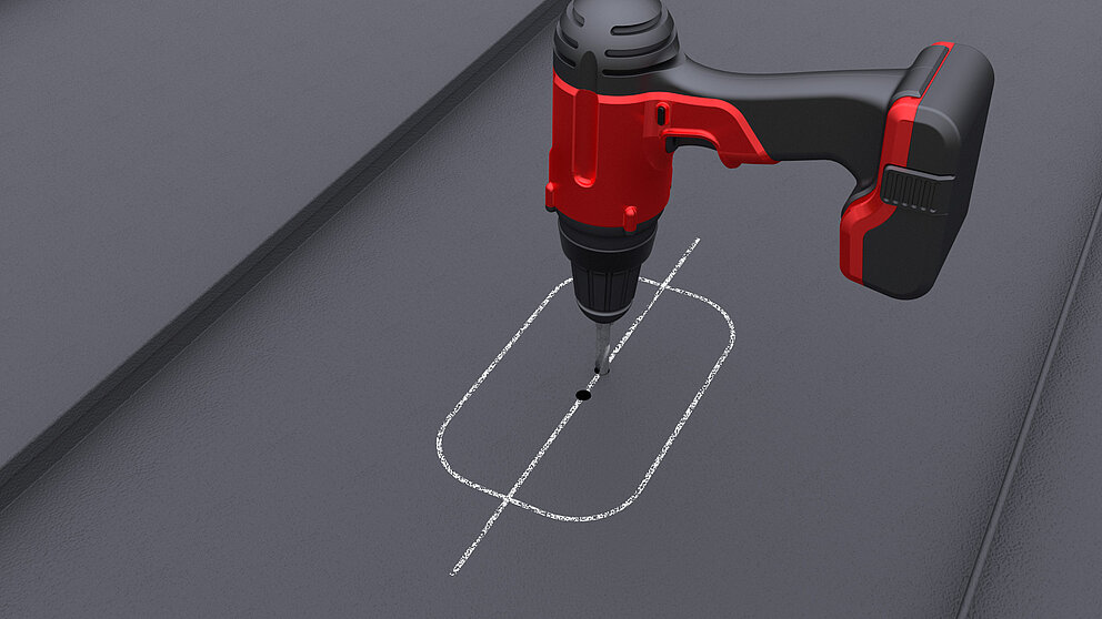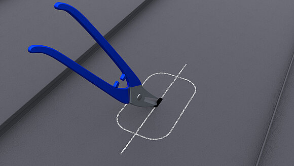 Körvonal és ovállyuk bejelölése. Ovállyuk (⌀ 13 mm) előfúrása a PREFALZ sarniban (furat elegendő kiselemes fedéseknél). Ovállyuk (⌀) kivágása a PREFALZ sarniból (elmarad kiselemes fedéseknél).