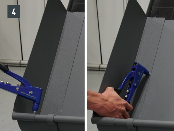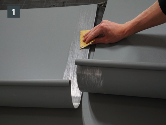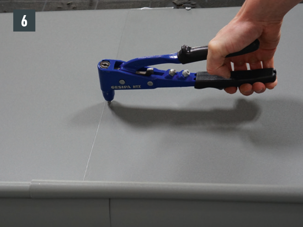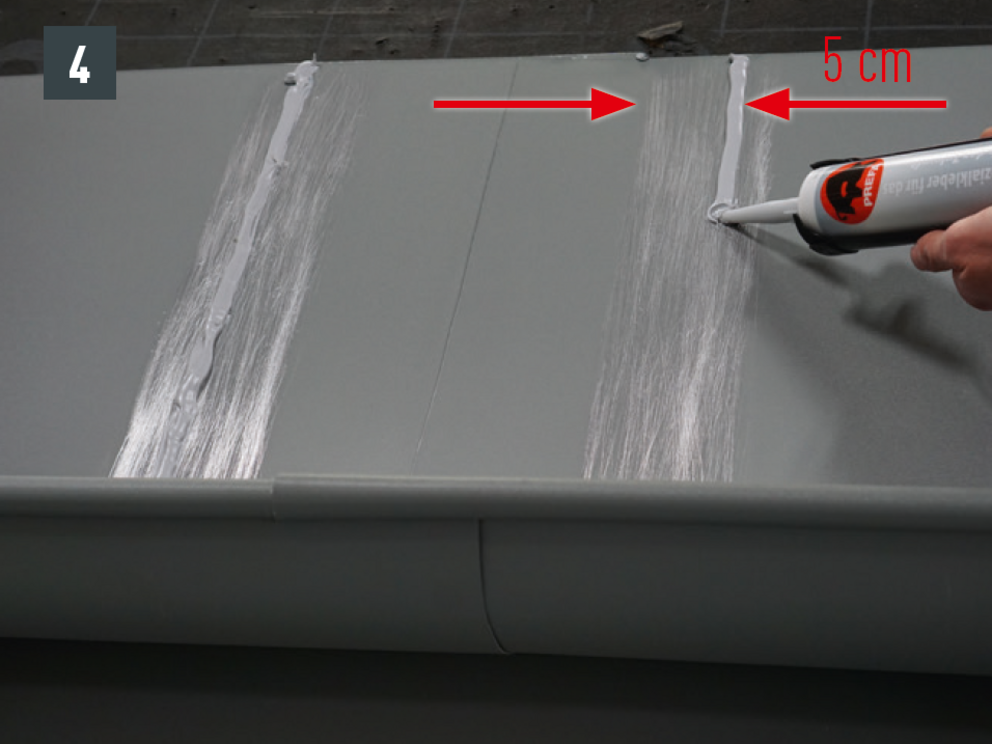 A fekvőeresz elemeinek összeépítése átlósan elhelyezett 20 db 4 x 9,5 mm-es PREFA patentszegeccsel és Prefa speciális szilikonnal tömítve is lehetséges.