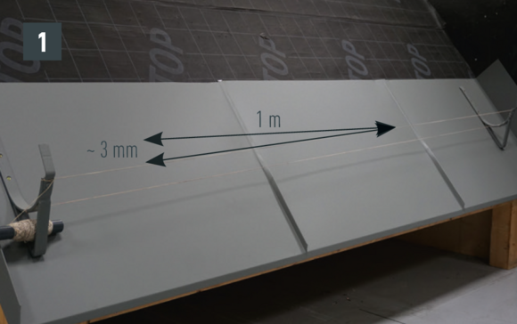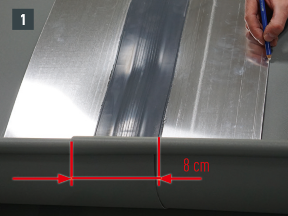 A zámszegélynek a fekvőeresz magaspontjához mérten, legalább 15 cm-el a fekvő ereszcsatorna tetősíkra felfekvő része fölé kell nyúlnia, és legalább 400 mm-es kiterített szélességgel kell rendelkeznie!