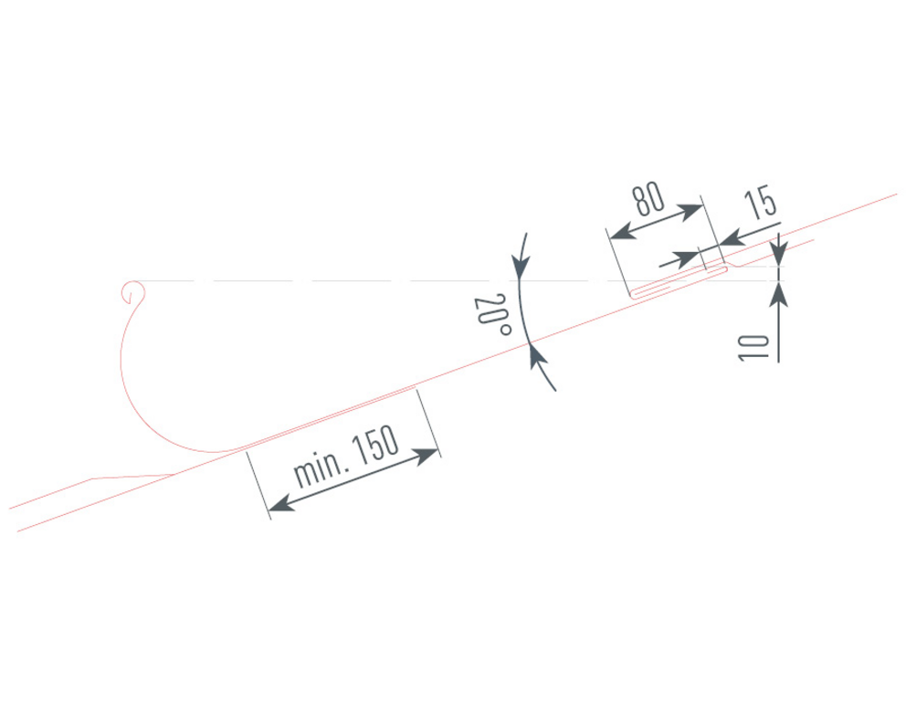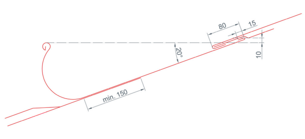 Ügyeljen arra, hogy a tető felőli csatornavisszahajtás 10 mm-rel magasabban legyen, mint az ereszcsatorna elülső pereme. Ebből következik, hogy a PREFA fekvőeresz alkalmazása esetén a minimális tetőhajlásszög 20° (lásd az alábbi ábrát).