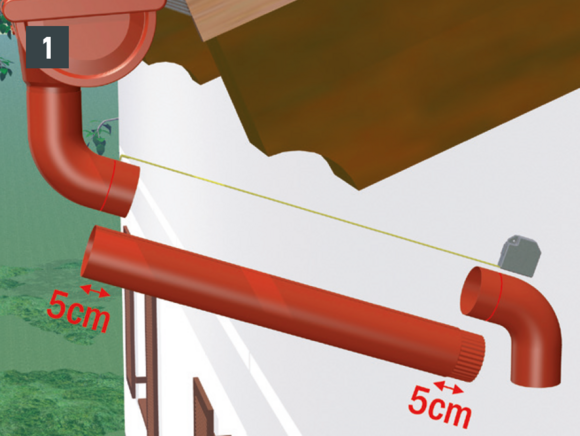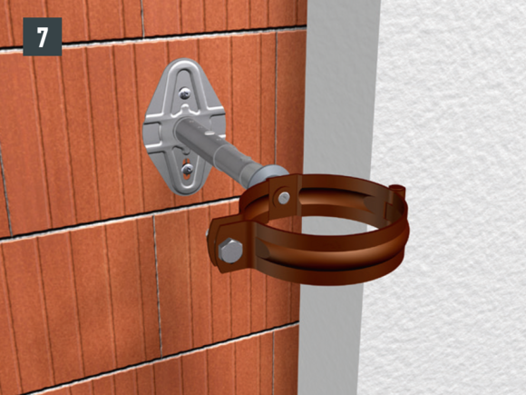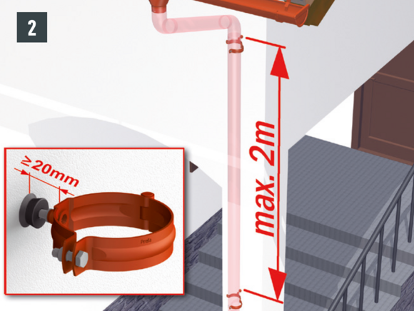 A csőbilincseket úgy kell felszerelni, hogy a cső hátsó oldala és a homlokzat között legalább 20 mm távolság legyen. A csőbilincsek közötti távolság nem haladhatja meg a 2 métert. (Nemzeti szabványok és szakmai előírások nagyobb távolságokat is megengedhetnek. A 3 m hosszú PREFA ejtőcsövek miatt a legfeljebb 2 m-es távolság bizonyult kivitelezhetőnek.)
