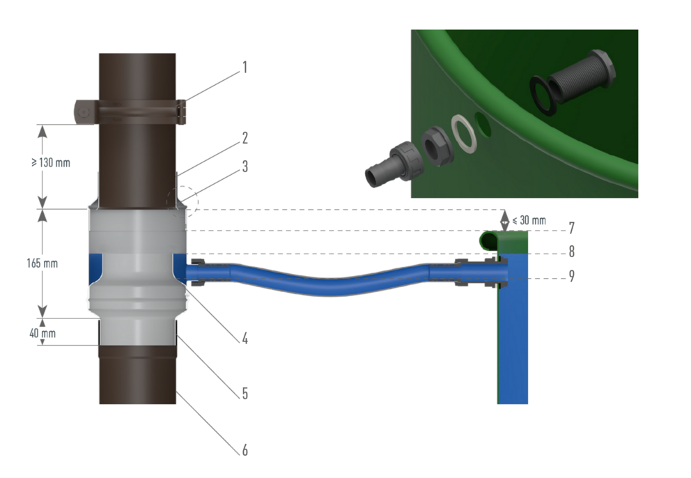 Az esővízgyűjtő közvetlenül a lefolyócsövön keresztül esővízzel tölti fel az esővíztárolót, és a kívánt magasságig tárolja a vizet.