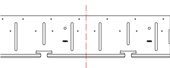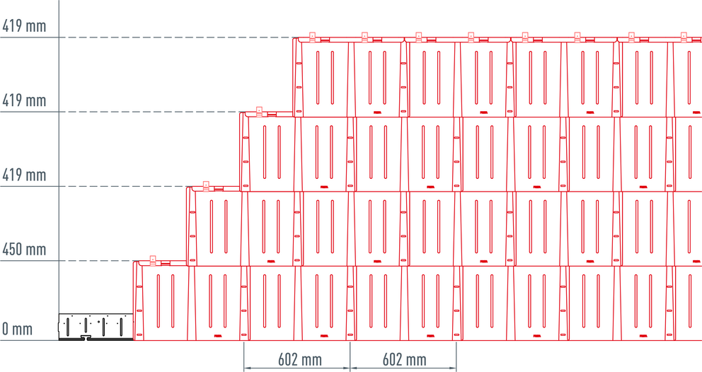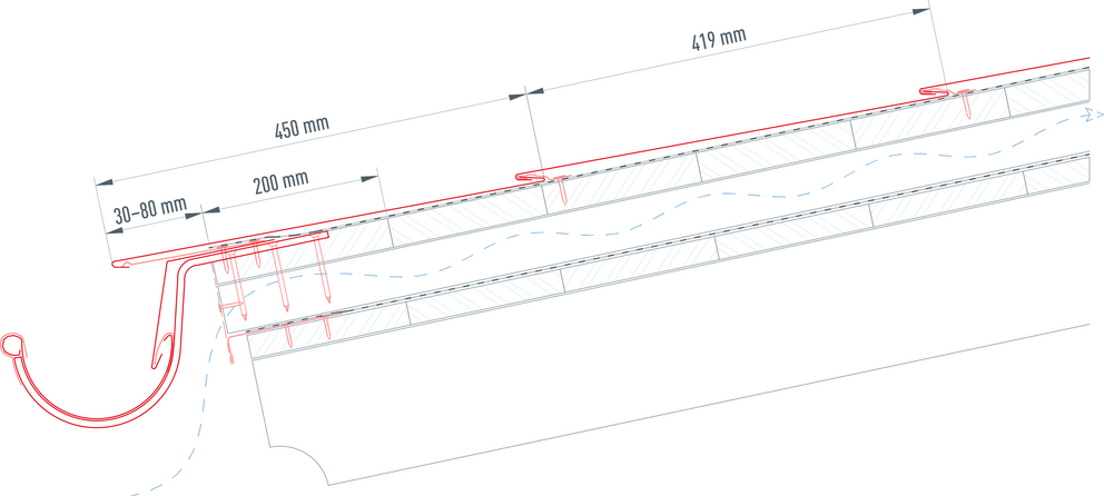 A kezdeti zsinórozás a tetőközéppontnál vagy az oromszegélynél történik. A párkányelem a tervezett panelelrendezéshez igazodik. A függőleges derékszögezést vagy a horony közepén (B változat) vagy középen két horony között (A változat) kell elvégezni. A vízszintes zsinórozás mindig 419 mm-re a lemez felső szélétől történik. A függőlegesen elvégzendő zsinórosztásnak 301 mm-rel oszthatónak kell lennie. A gyakorlatban a zsinórcsapás 5 lemezenként (1505 mm), ill. 10 lemezenként (3010 mm) történik függőleges irányban. Ügyeljen arra, hogy a zsinórozás teljes hosszában egyenes legyen.
