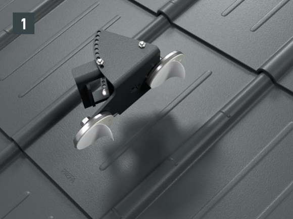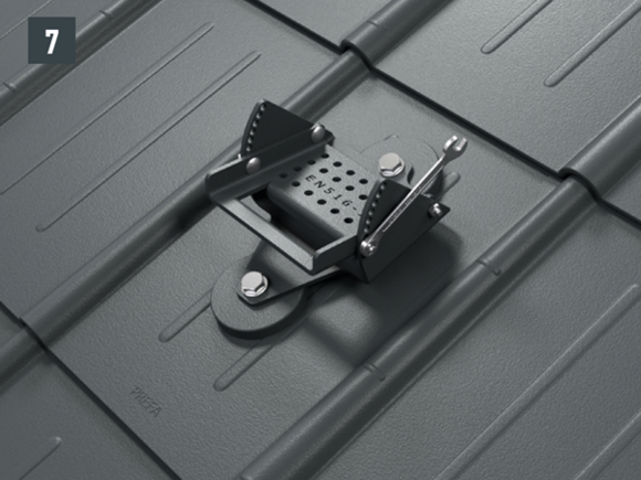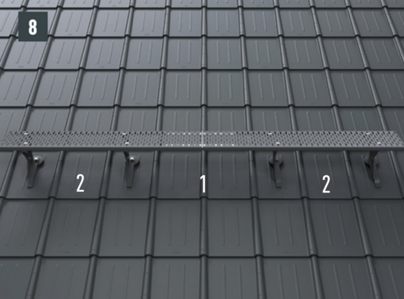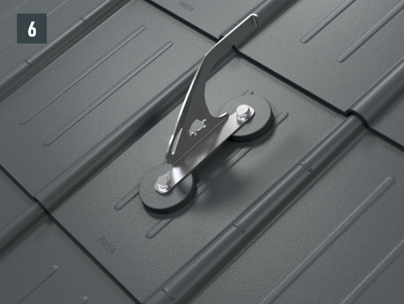 A PREFA alkalmazástechnikai irányelv, az érvényes szabványokat és iparági előírásokat be kell tartani. A biztonsági tetőhorgokat a mellékelt csavarokkal a szarufa közepére kell felszerelni.