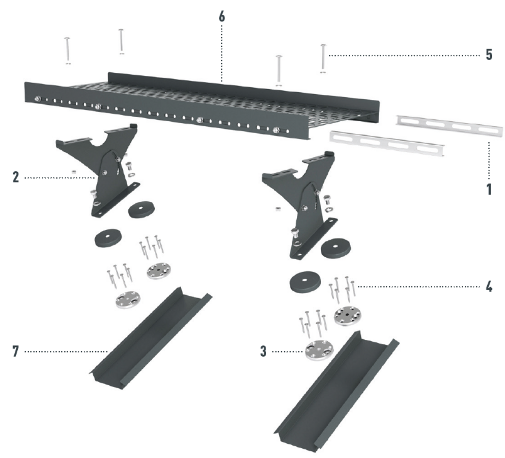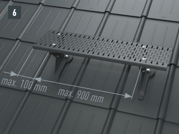 Alapfeltétel egy, a vonatkozó szabványok/szakmai szabályok szerint legalább 24 mm vastagságú teljes deszkázatra és teherhordó alátétszerkezetre szerelt PREFA tetőfedő rendszer megléte. A szarufatávolság legfeljebb 1000 mm lehet. A járórács-tartó elemeket a deszkázatra kell felszerelni a mellékelt talpelemekkel. |