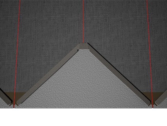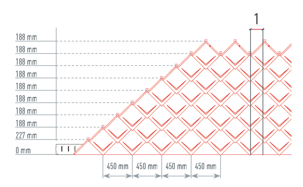 A 29 × 29 PREFA tetőfedő rombuszok elhelyezésének megkönnyítése érdekében 450 mm-enként célszerű függőleges zsinórvonalakból álló zsinórképet készíteni (ehhez a párkányelemen található jelölések is segítséget nyújtanak). Annak érdekében, hogy a zsinórméret minden sorban pontosan tartható legyen, szükség esetén a zsinórméret felét is meg lehet jelölni, amit rendszeres távolságonként ellenőrizni kell. Igazítsa hozzá a felső szélükön megjelölt indítólemezeket a függőleges zsinórvonalakhoz. Ennek során ügyelni kell arra, hogy az oldalsó felhajtás (pl. oromszegély-kialakítás) területe ne a 29 × 29 tetőfedő rombuszok közepén legyen (szimmetria/tetőközéppont figyelembevétele).