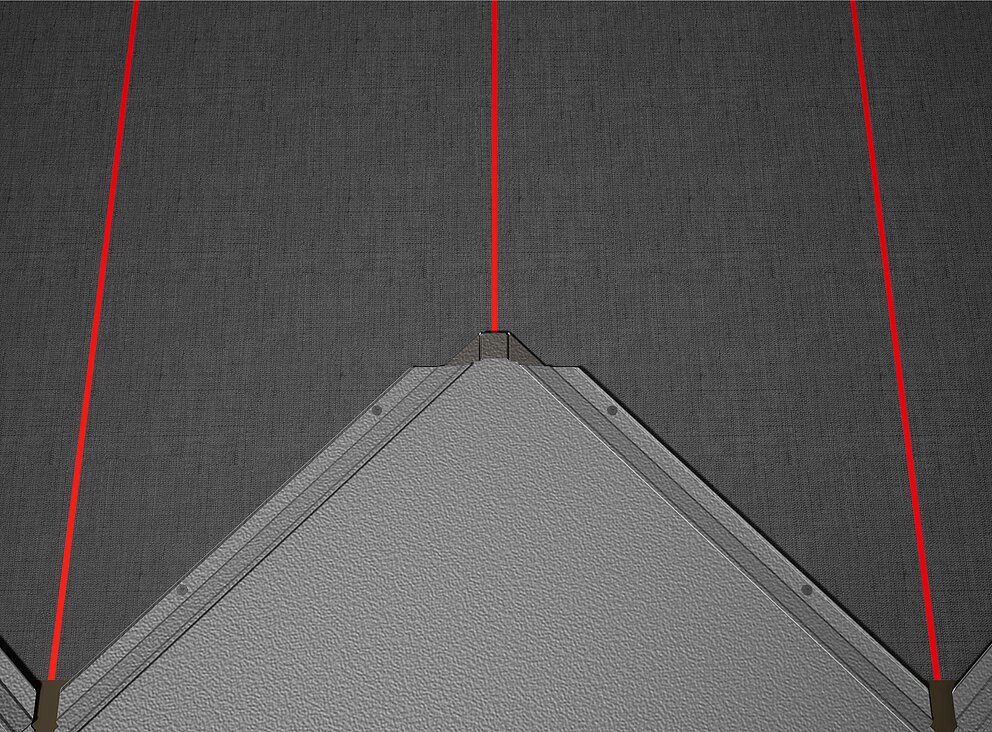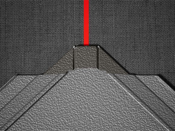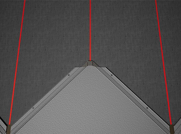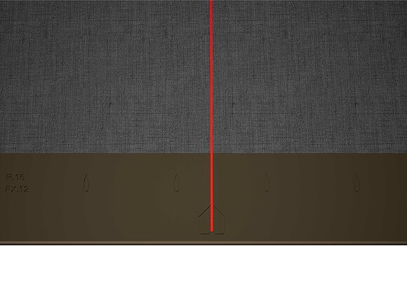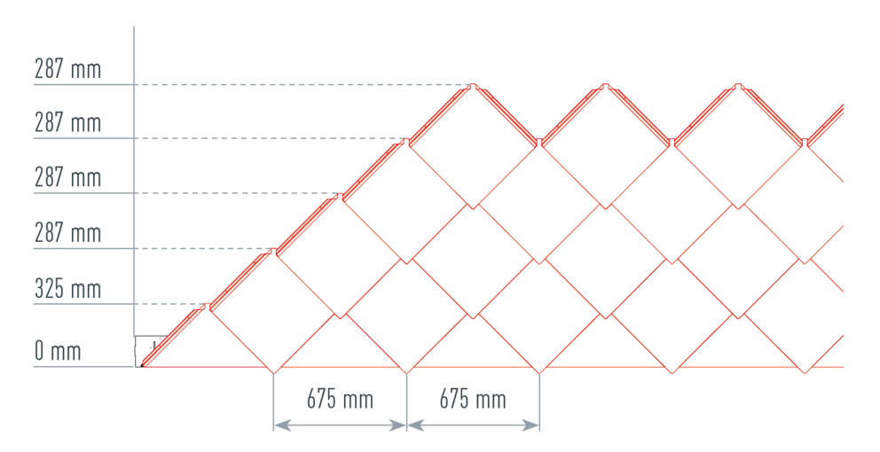 A 44 × 44 PREFA tetőfedő rombuszok elhelyezésének megkönnyítése érdekében 675 mm-enként célszerű függőleges zsinórvonalakból álló zsinórképet készíteni (ehhez a párkányelemen található jelölések is segítséget nyújtanak). Annak érdekében, hogy a zsinórméret minden sorban pontosan tartható legyen, szükség esetén a zsinórméret felét is meg lehet jelölni, amit rendszeres távolságonként ellenőrizni kell. Igazítsa hozzá a felső szélükön megjelölt indítólemezeket a függőleges zsinórvonalakhoz (lásd az alábbi ábrát). Ennek során ügyelni kell arra, hogy az oldalsó felhajtás (pl. oromszegély-kialakítás) területe ne a 44 × 44 tetőfedő rombuszok közepén legyen (szimmetria/tetőközéppont figyelembevétele).