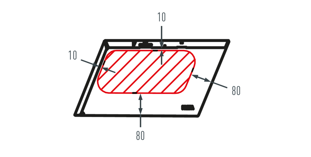 A tetőkiegészítők felszerelésekor ügyeljen a tetőfedő zsindelyeken engedélyezett szerelési területre. A következő ábra a talpelemeken lévő kiegészítő termékek szerelésére szolgáló területet mutatja. Elképzelhető, hogy más kiegészítő termékek esetében ettől eltérő szerelési területek vannak érvényben.