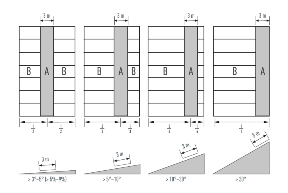 A fixhafteres terület hossza 3 méter legyen. A fixhafteres terület helyét alapvetően a tetőhajlásszögtől függően kell megválasztani – lásd az alábbi ábrát és a kapcsolódó táblázatot. A tetőáttörések vagy a tető alakja befolyásolhatja a fixhafteres terület helyét. A különböző magasságban elhelyezkedő fixhafteres terüleket egymástól a hőtágulást biztosító elválasztósávokkal kell elkülöníteni.