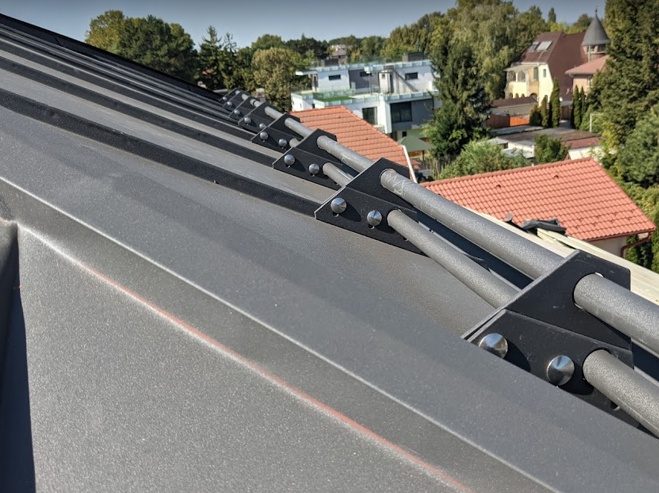 Mivel a PREFA kettős állókorcos és kiselemes rendszerű tetőket a villámvédelelmi rendszerben természetes levezetőként fogadja el a szabvány, ezért csak a felfogást és az ereszvonal alatti levezetést kell kiépíetni.