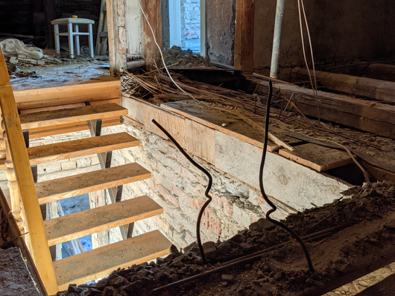 Egyik legfontosabb kérdés a toronyszoba kapcsán talán az volt, hogyan tudunk feljutni oda. Erre több lehetséges megoldás is született, többek között egy panoráma lift terve is képbe került, ami ugyan látványos lett volna, de magas költségei miatt végül elvetették, és a hagyományos lépcsős megoldás mellett döntöttek. A lépcső eredeti kialakítása nem túl átgondoltan történt anno. Egy 20x20-as fa födémgerendát kettévágva alakították ki a helyét, és mert a tartó funkciót valamivel pótolni kellett, ezért nemes egyszerűséggel acél drót segítségével egy pallóhoz erősítették. A hőszigetelés problémáját is igen „kreatívan” oldották meg a korabeli „szakemberek”: amit találtak, minden koncepció nélkül befogták erre a célra.