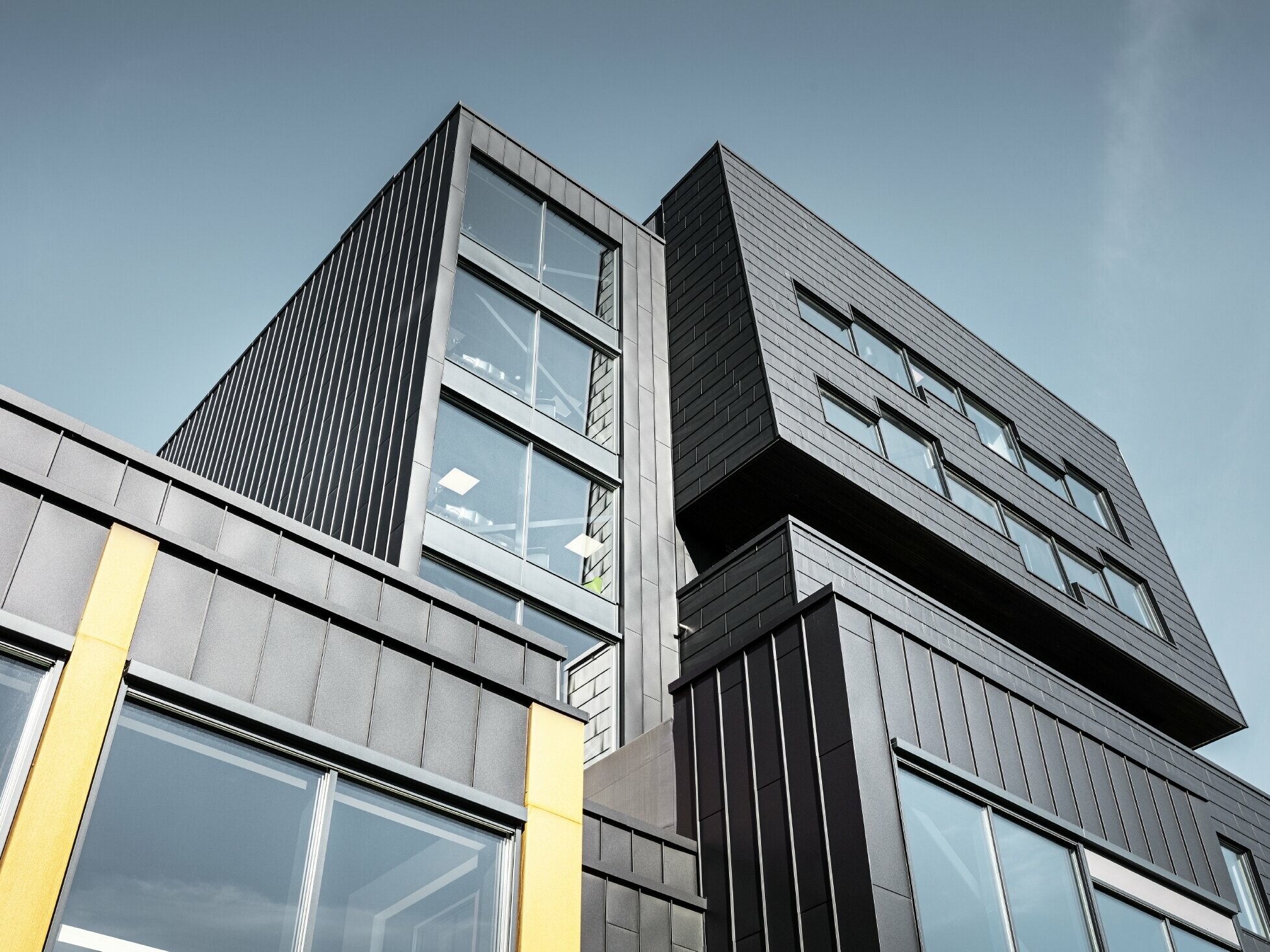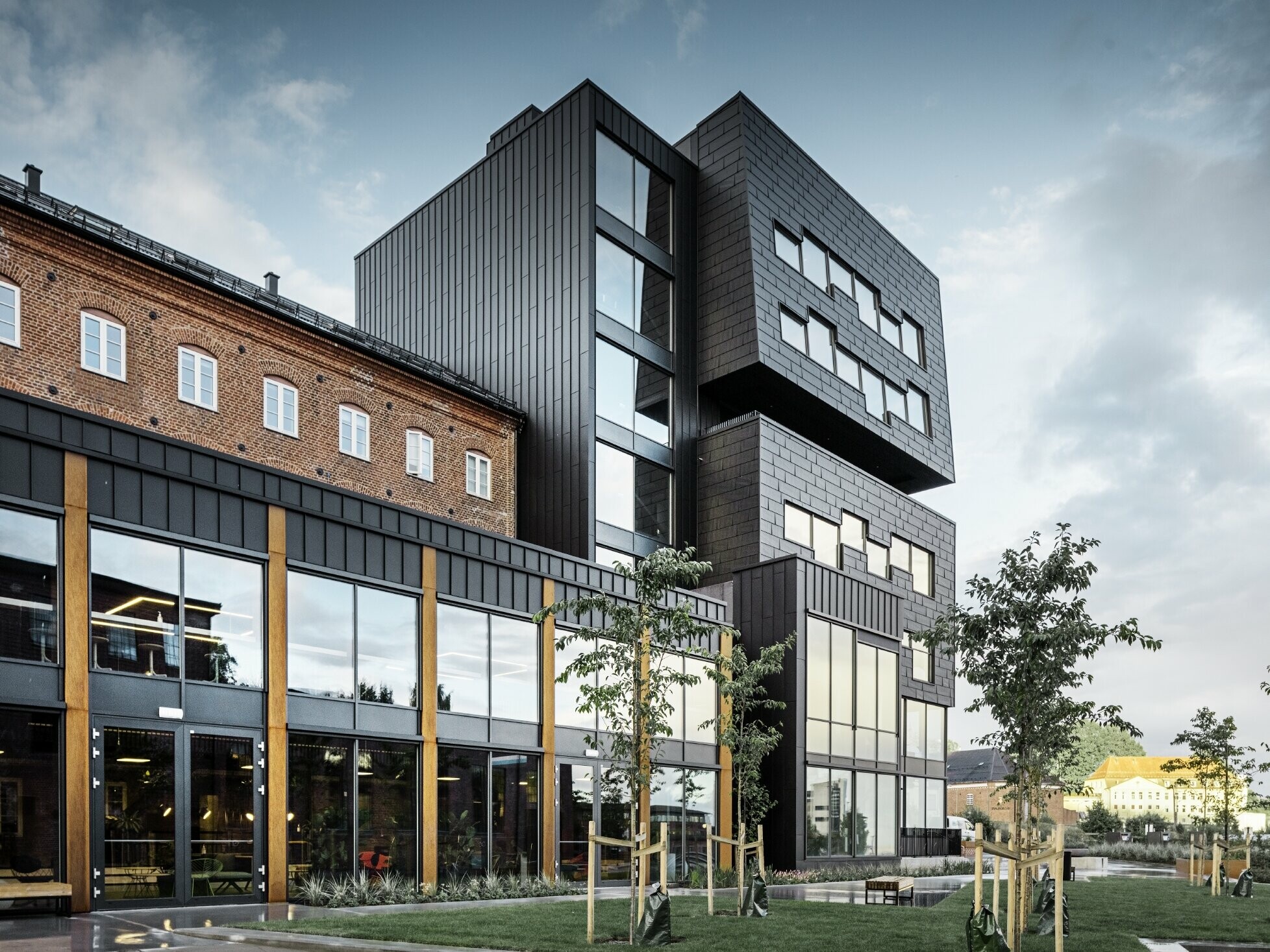 Fekete, mint a larvikit – vagy mint a medvecukor, a fjordok közötti mély víz, vagy éppen a tagolt PREFA FX.12, esetleg a Prefalz P.10 homlokzatburkolat. A part menti Larvik változó fényviszonyai között az épület fekete burkolata napszakonként eltérő: szürkületkor aranybarnává válik, napfelkelte után pedig akár borókakéknek is nevezhetnénk. Utóbbi szín az egykori Fritzøe Mølle ipari malom homlokzatának jellegzetes színe volt. A PV arkitekter, a Herman Nilsen & Sønner és a malom tulajdonosa, Treschow-Fritzøe számára nem ez volt az első közös munka - évek óta dolgoznak a terület revitalizációján. Lokálpatriótaként tesznek a város közösségéért a saját szakterületükön: otthonul vagy éppen munkahelyként szolgáló élhető, szép épületeken dolgoznak.