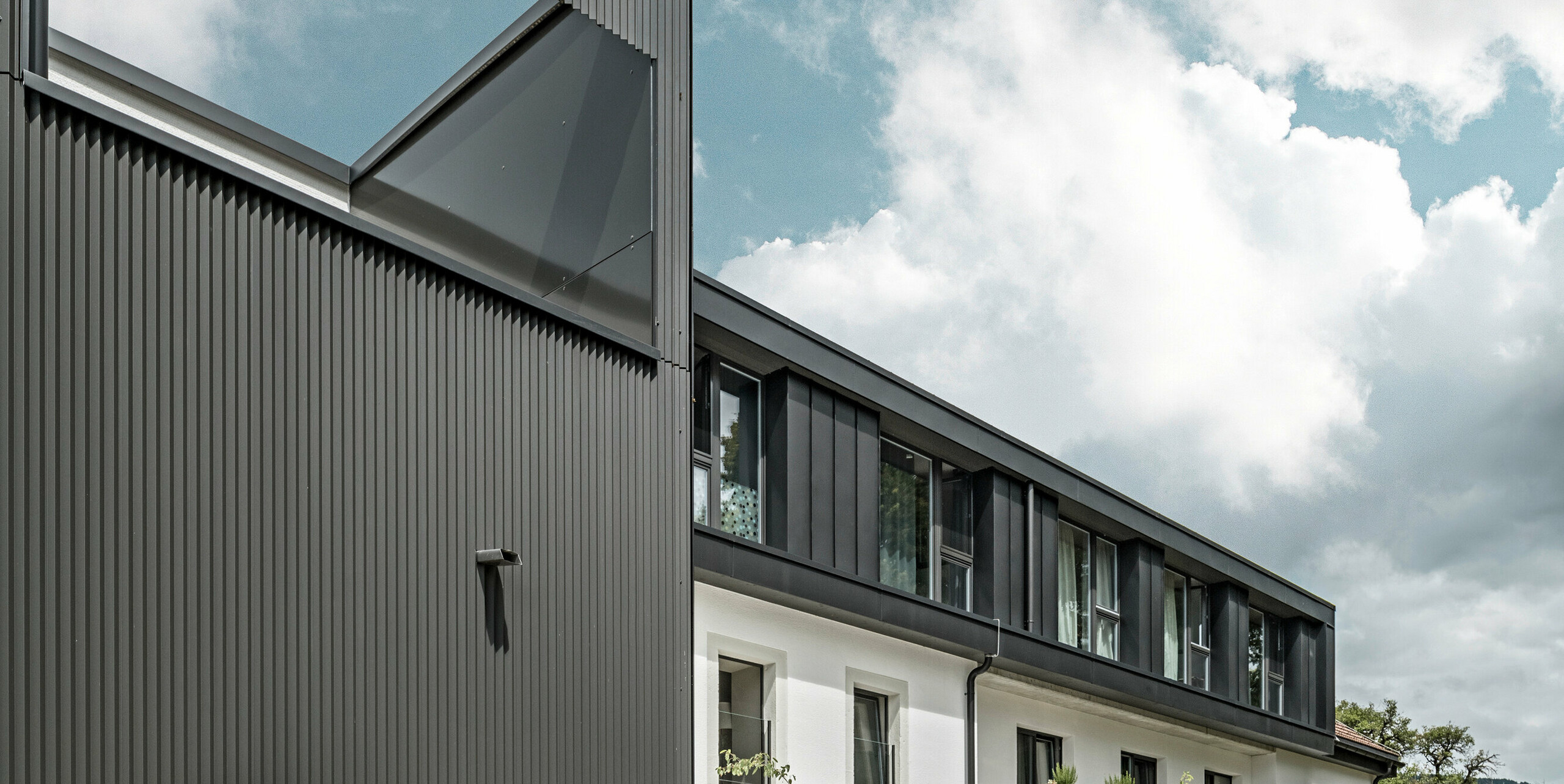 Mintegy 350 m² felületen burkolták sötétszürke egyedi színű PREFA fogazott profillal a Hotel de l’Ours Prêles épületét. A fogazásnak köszönhetően páratlan megjelenésű a szálloda homlokzata, melyen érdekes fény-árnyék játék kel életre.