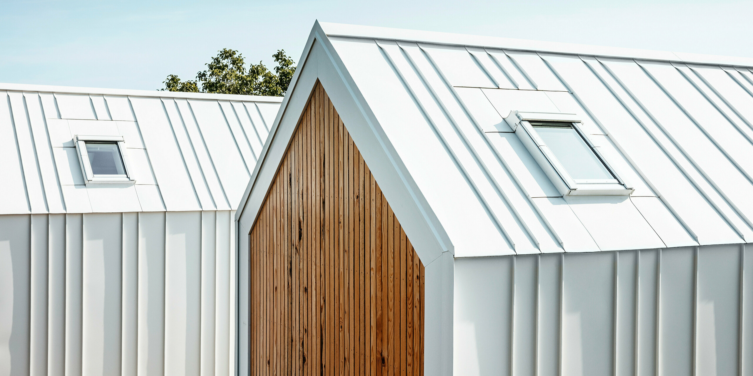 A két moduláris épület faszerkezetes technológiával, 85 %-ban fából készült. A mikroházakat P.10 tisztafehér színű PREFALZ lemezek borítják. A fehér állókorcos fedést eltérő lemezszélességekkel alakították ki, és elegáns részletekkel látták el. Az épületéleknél például a külső korcok valamivel magasabbak, ezzel expliciten kihangsúlyozva a mikroházak egyszerű formáját. A magas minőségben kivitelezett korcoknak és vonalaknak köszönhetően az anyag lágy és egymásba folyó hatást kelt.