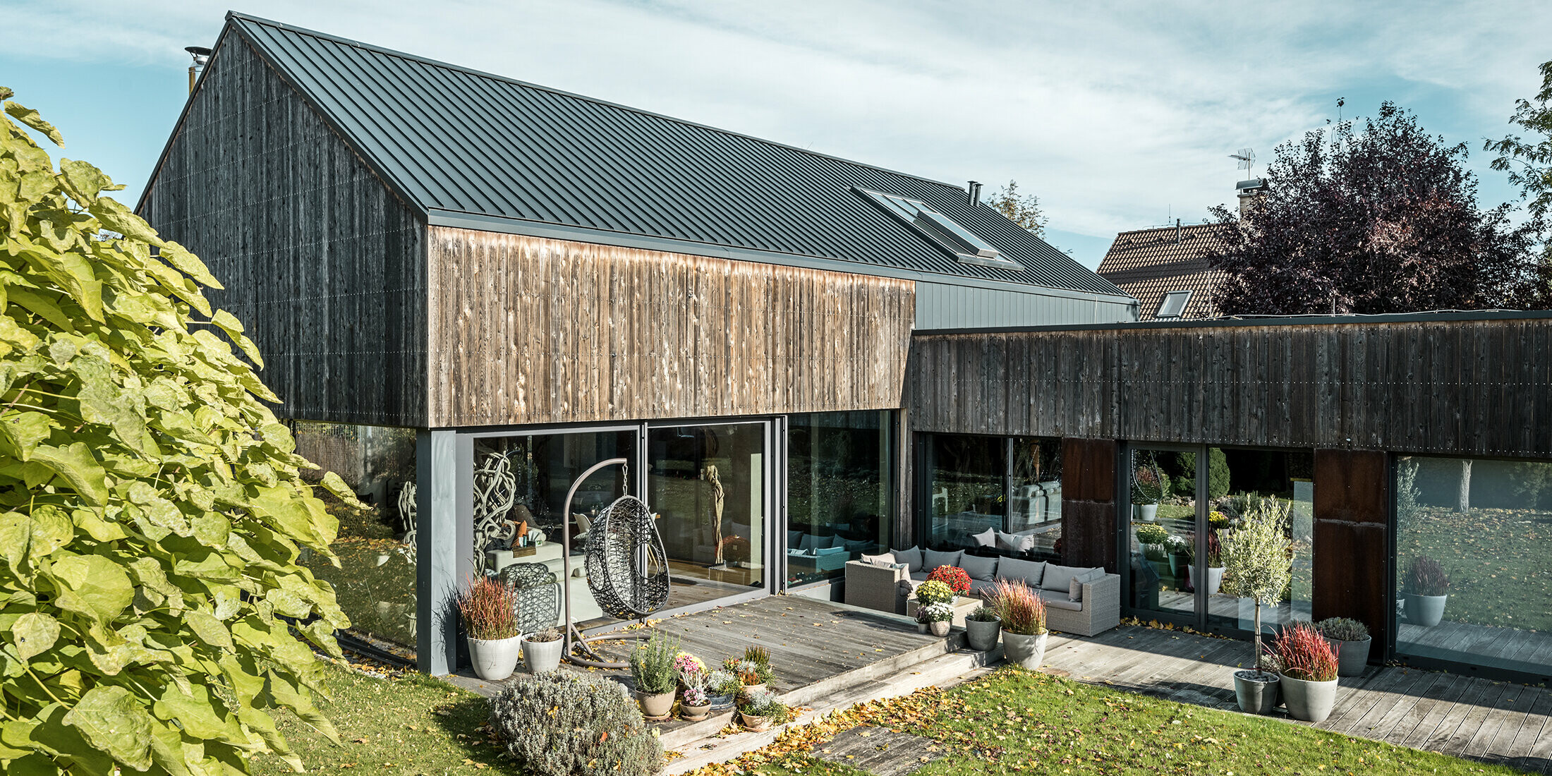 A nyeregtetőt PREFALZ elemekből készült dupla állókorcos tetővel fedték. A homlokzat túlnyomó részét kanadai cédrusfával borították, amit P.10 antracit PREFALZ elemek tesznek teljessé.